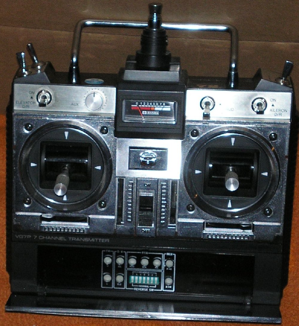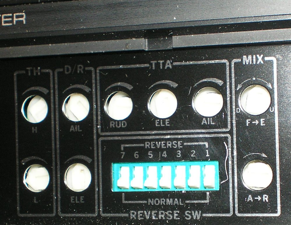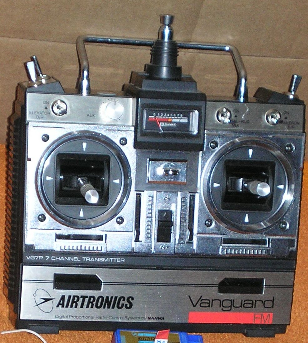The old FM radios were marketed in a three tier scheme. Low end radios had four channels with servo reversing, and that’s all. At the high end, what we used to call “computer radios” had multi model memory, reversing, channel mixing, exponential travel, end point adjustment, etc, all done digitally on a screen, plus other features such as dual rates, with digitally controlled rate settings. The mid tier radios had no computer screen or menus, but they did have nice features that the low end radios lacked. They typically had 5 to 7 channels, dual rates, rate adjustment, basic mixing for flaps to elevator and ailerons to rudder, and a decent three position flap switch or infinitely variable knob. These functions were adjusted via little tiny switches and trim pots that were usually found under a hatch and manipulated with a small screwdriver. Here’s a great example, the Airtronics Vanguard 7 channel. I have one of these radios that I bought in the 1990s.
