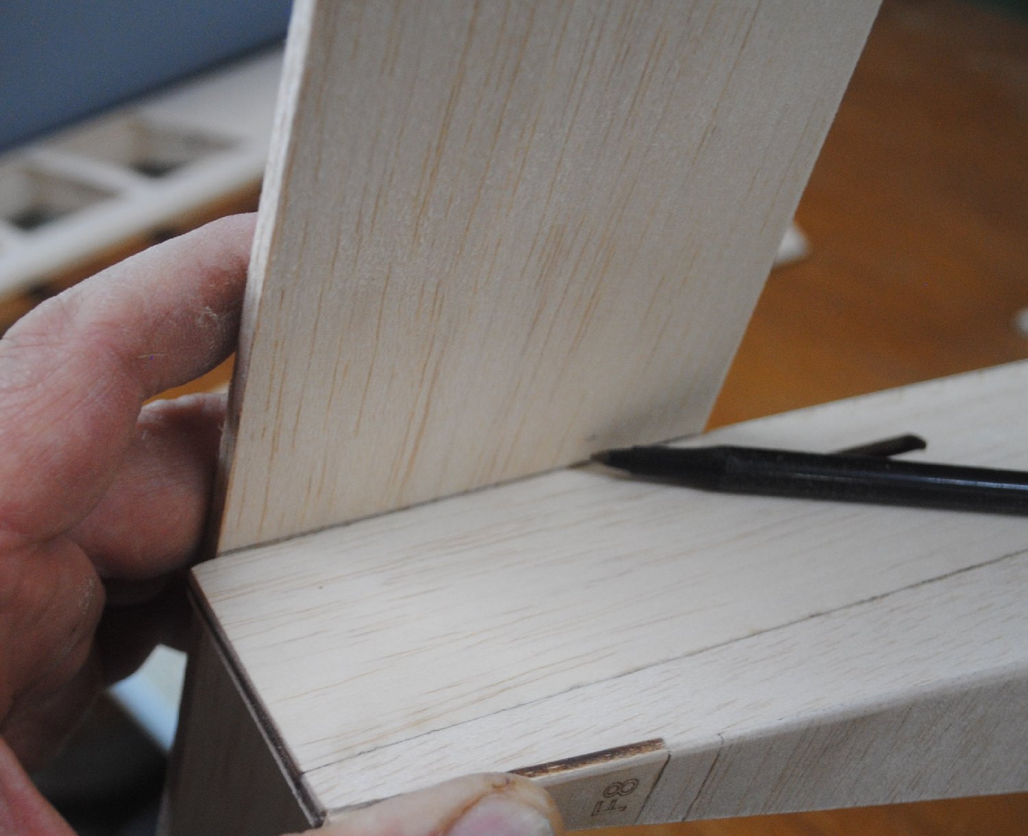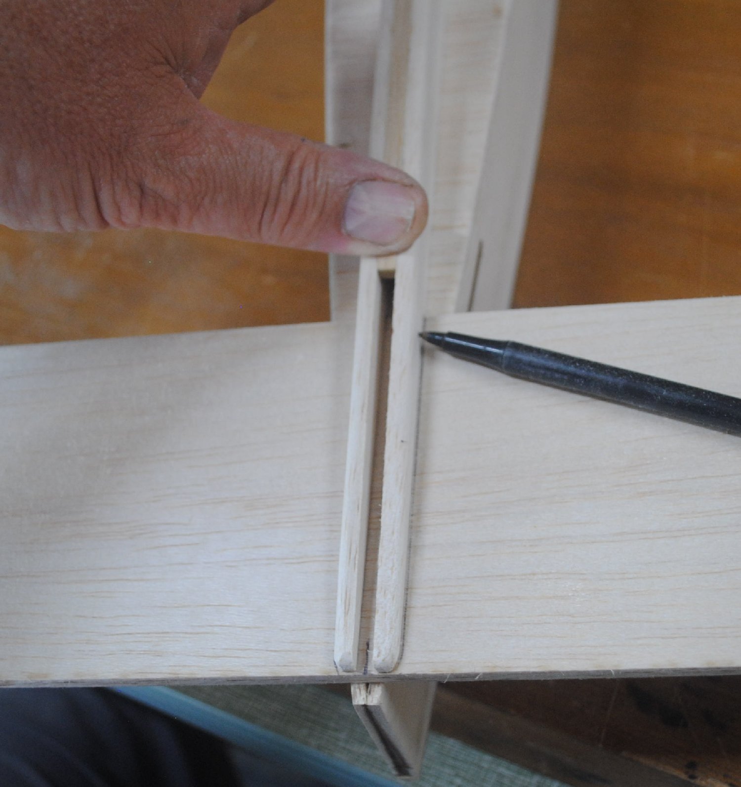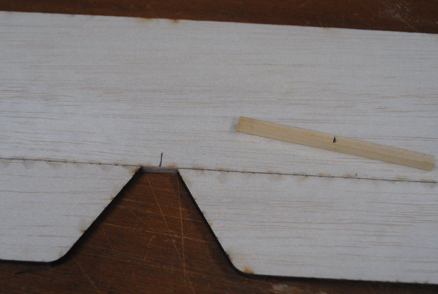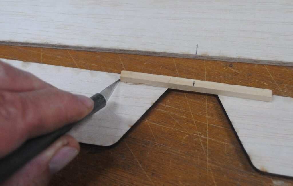 Use a hobby knife to mark the portion of the elevators to be cut out to accommodate the joiner stick. You need a precise fit, and the knife can make a more accurate mark than a pen.