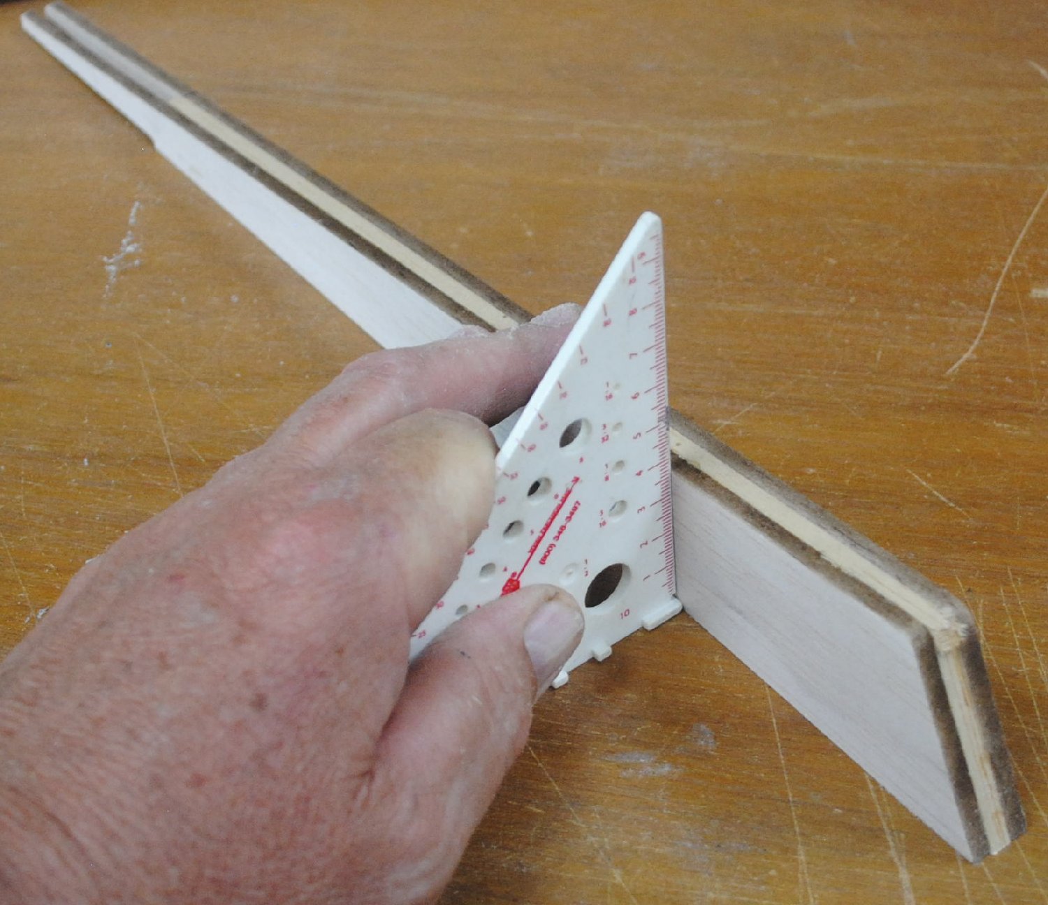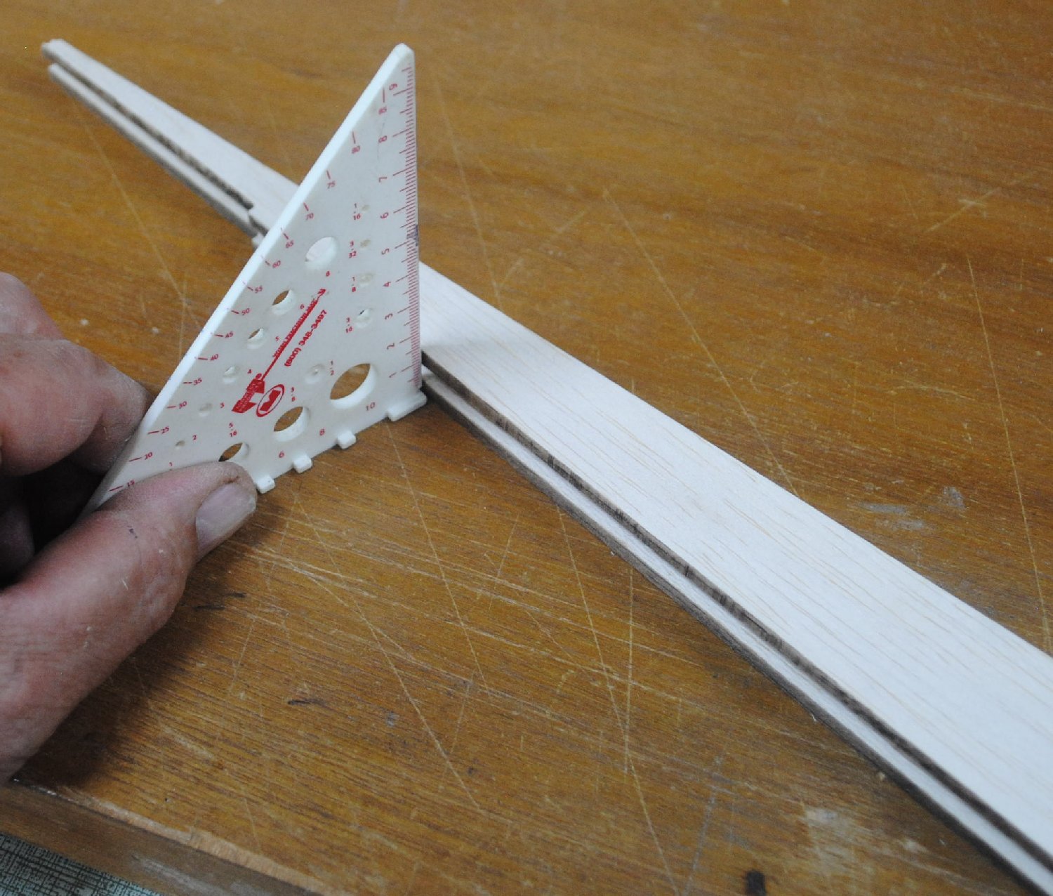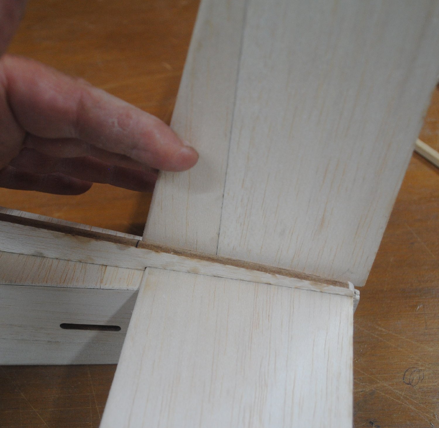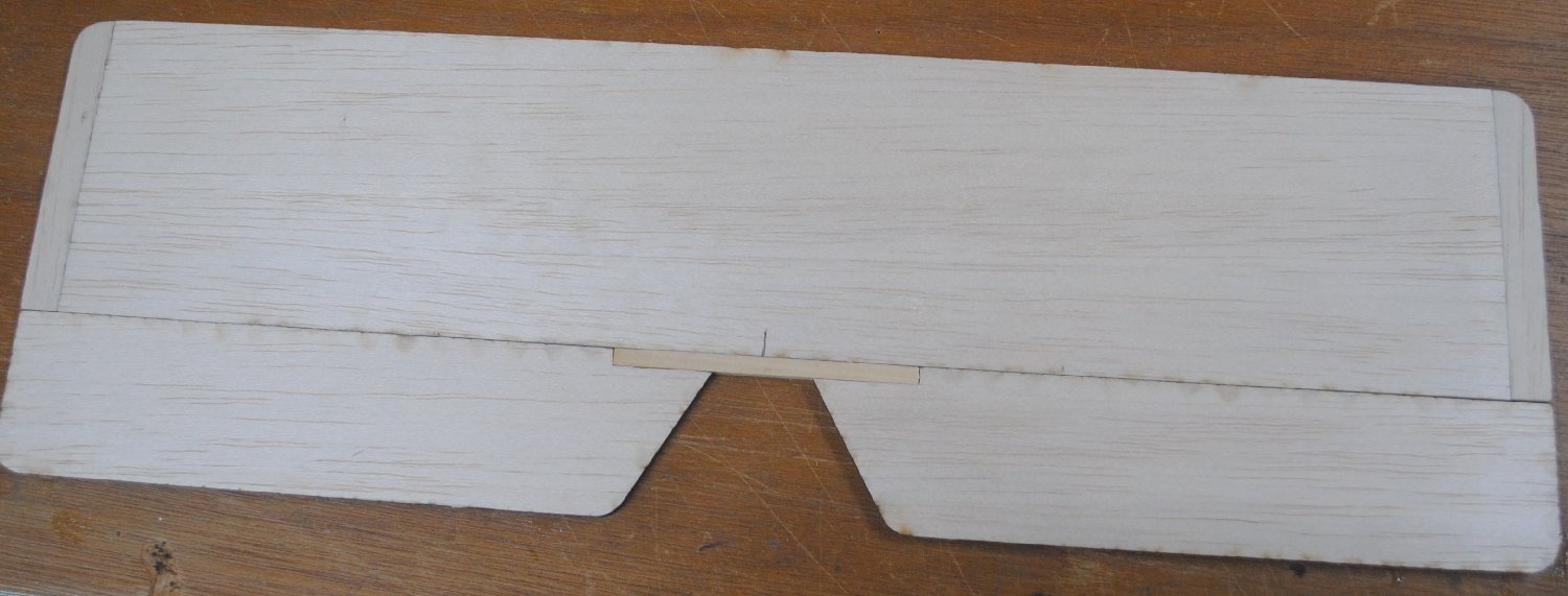 Put the elevators where they belong, with the tips flush with the stabilizer tips. Set the joiner stick on top of the elevators, aligned with the center of the stabilizer.
