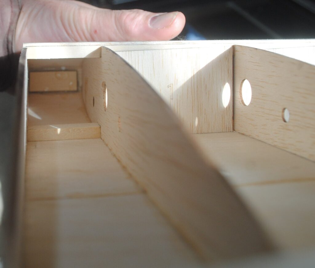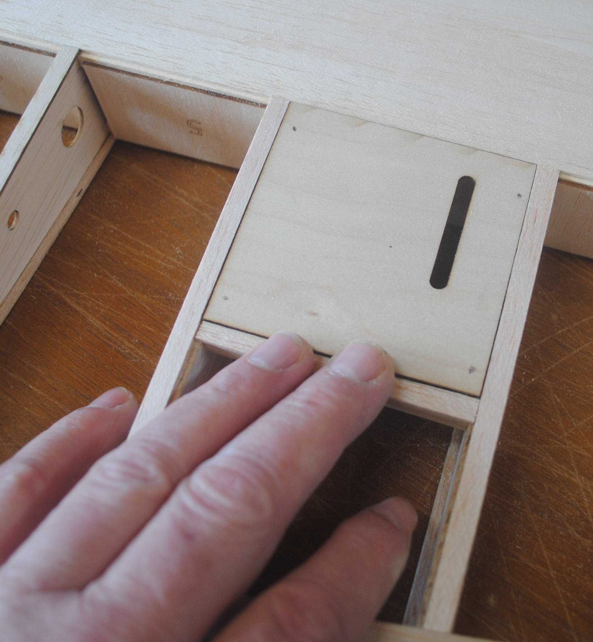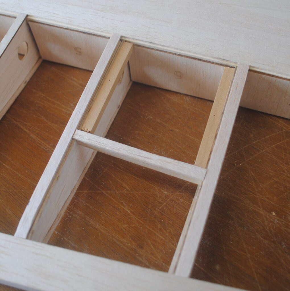 Attach the 1/4 x 1/4 balsa sticks to the ribs in the servo bay. In this case the sticks are inside the servo bay.