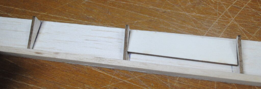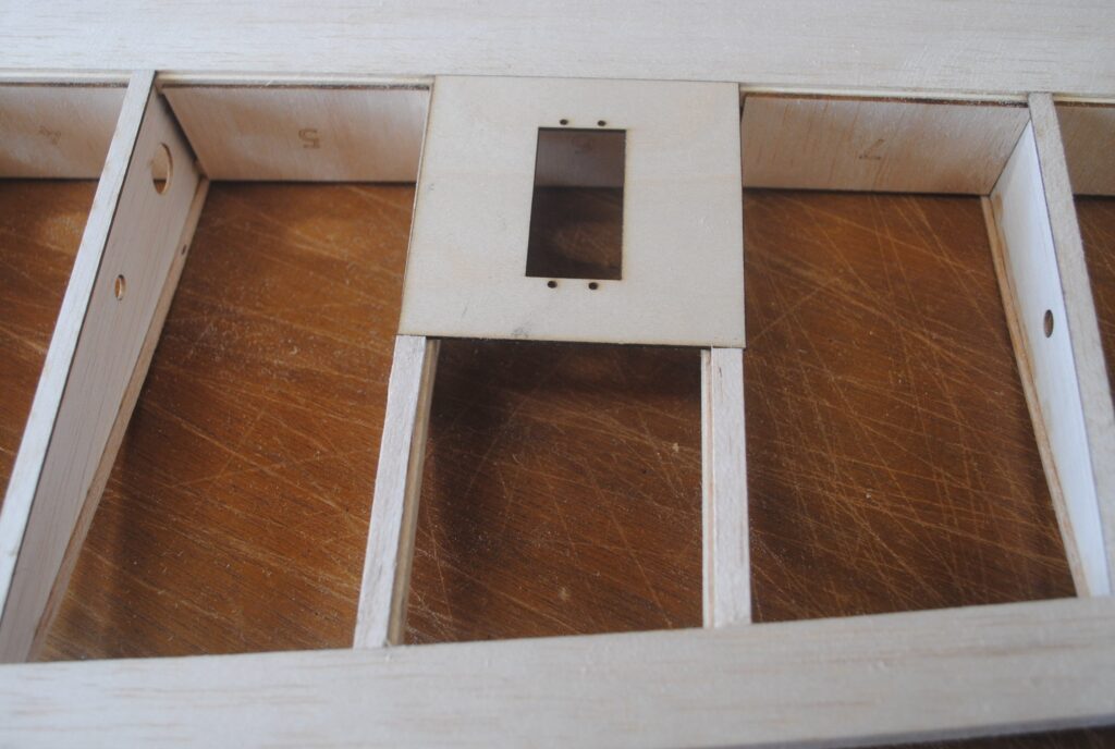 Attach 1/4 x 1/4 bass wood sticks to the two ribs, this time on the inside the servo bay. Place 1/16″ balsa cap strips to outline the servo plate and bring everything flush with the wing sheeting. Try to leave just a tiny bit of space around the servo plate to accommodate the covering film.