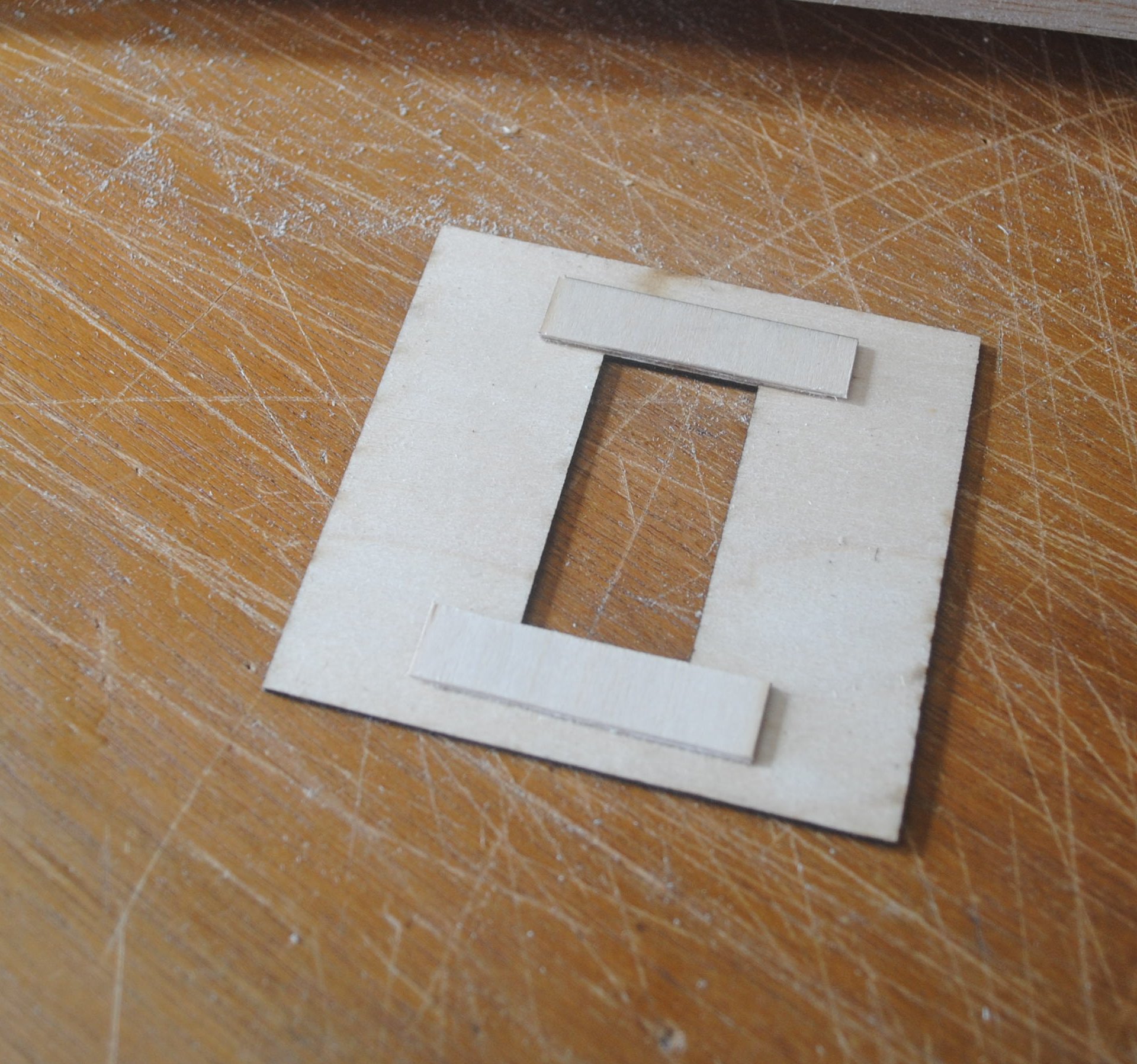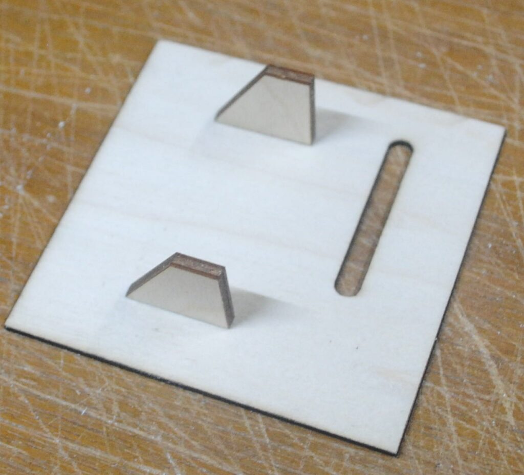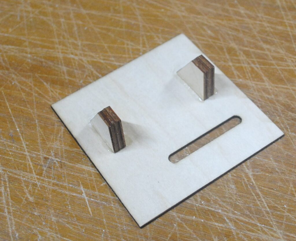 The screw blocks are two layers of 1/8″ birch plywood. Put glue on one edge of one piece of plywood and stick it to the servo plate, using the servo as a guide. Then repeat with one layer on the opposite side.