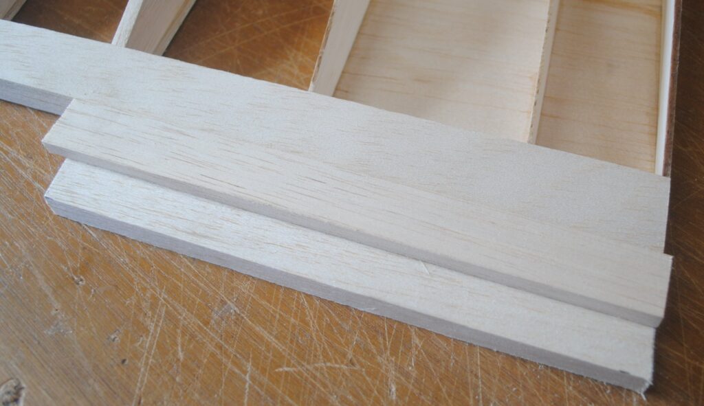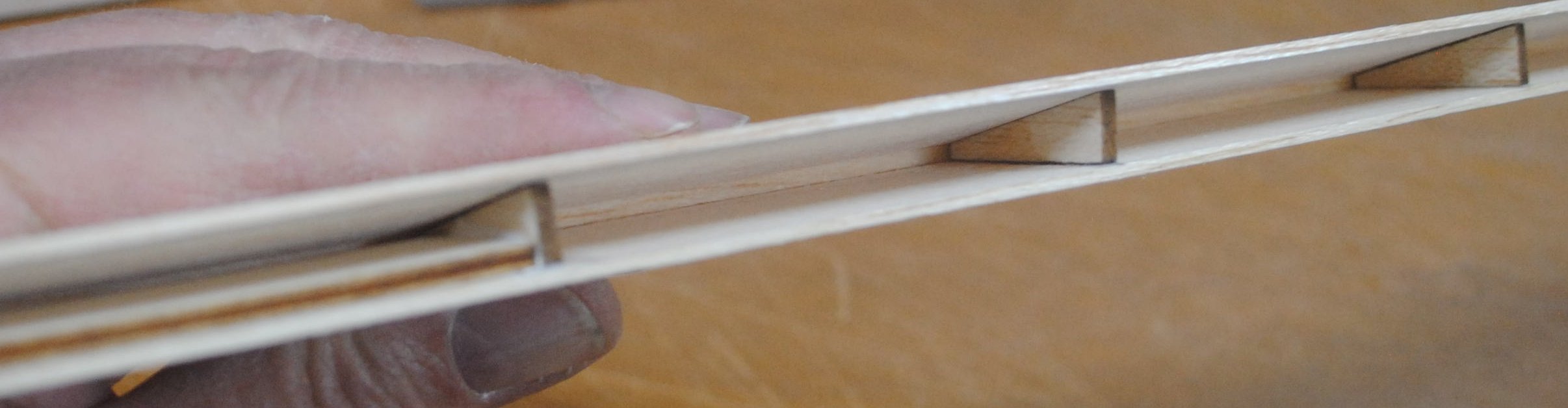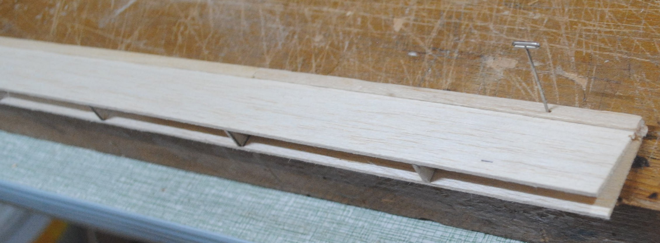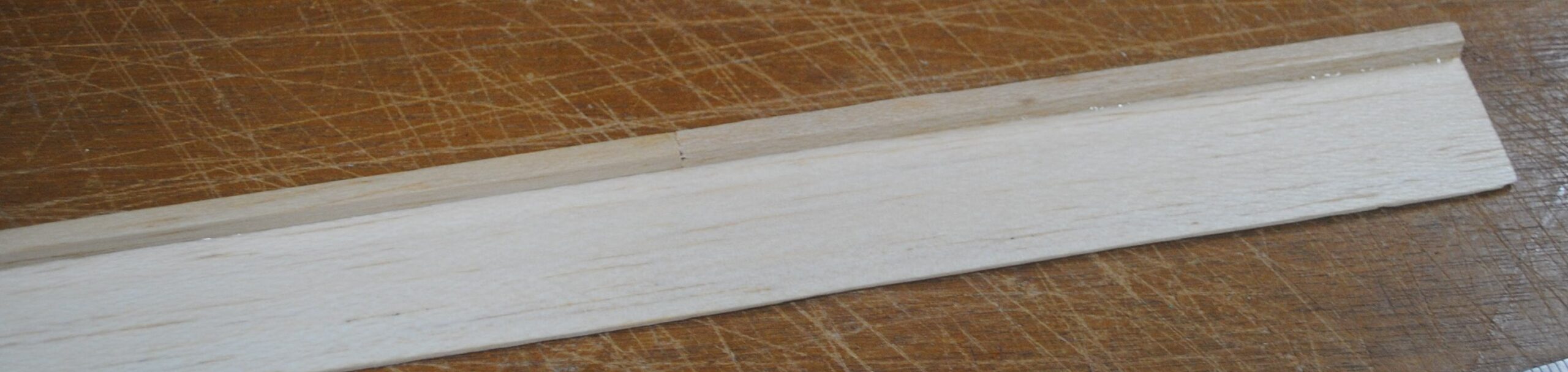 Cut a strip of 1/16″ balsa 1 5/16″ (that’s one and five sixteenths) wide and about 30 inches long. Lay it on the table and glue a 3/16″ x 3/16″ square balsa stick on top of it, flush at one edge.