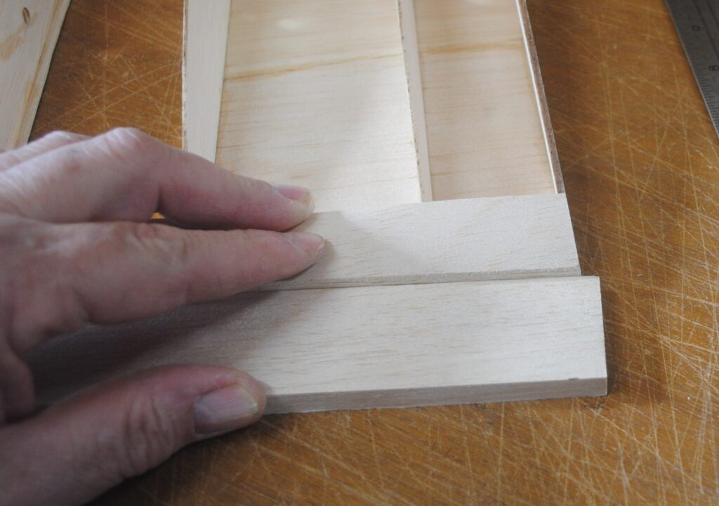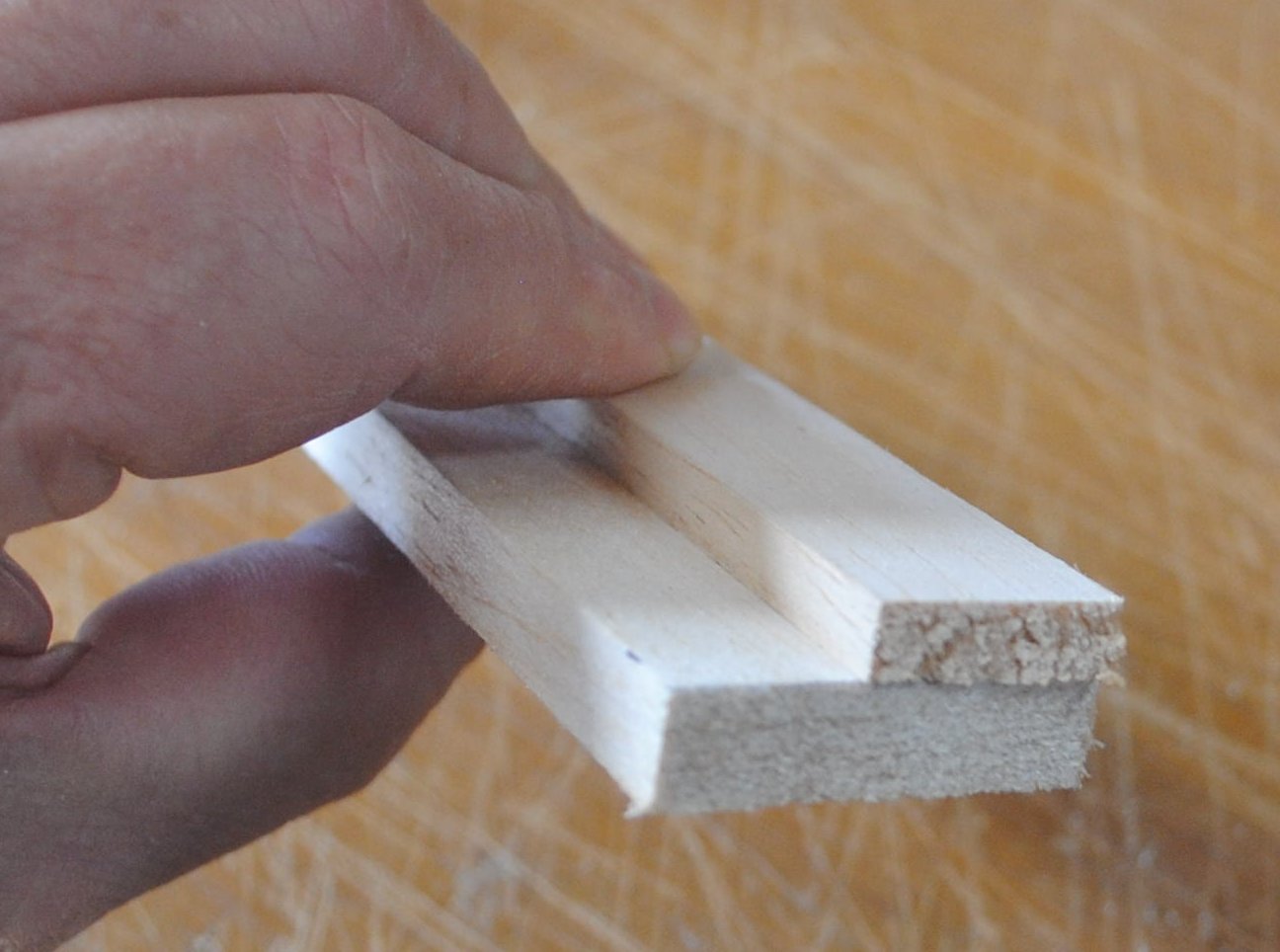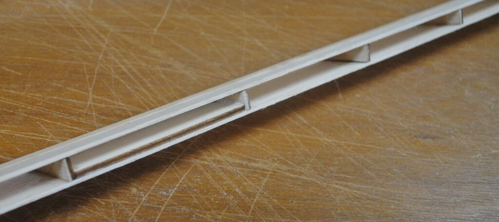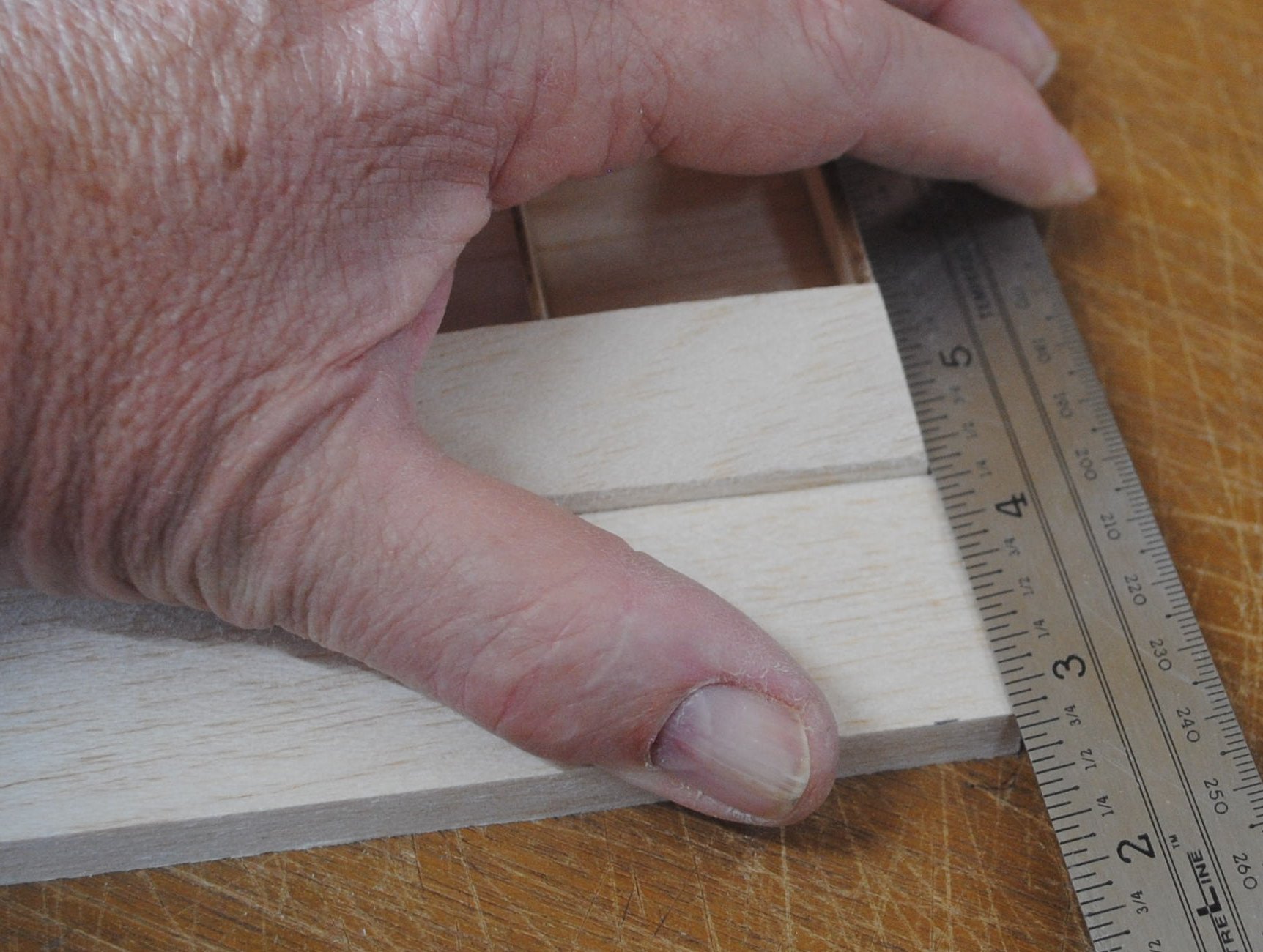 Cut a strip of 1/16″ balsa 1 5/16″ (that’s one and five sixteenths) wide and about 30 inches long. Lay it on the table and glue a 3/16″ x 3/16″ square balsa stick on top of it, flush at one edge.