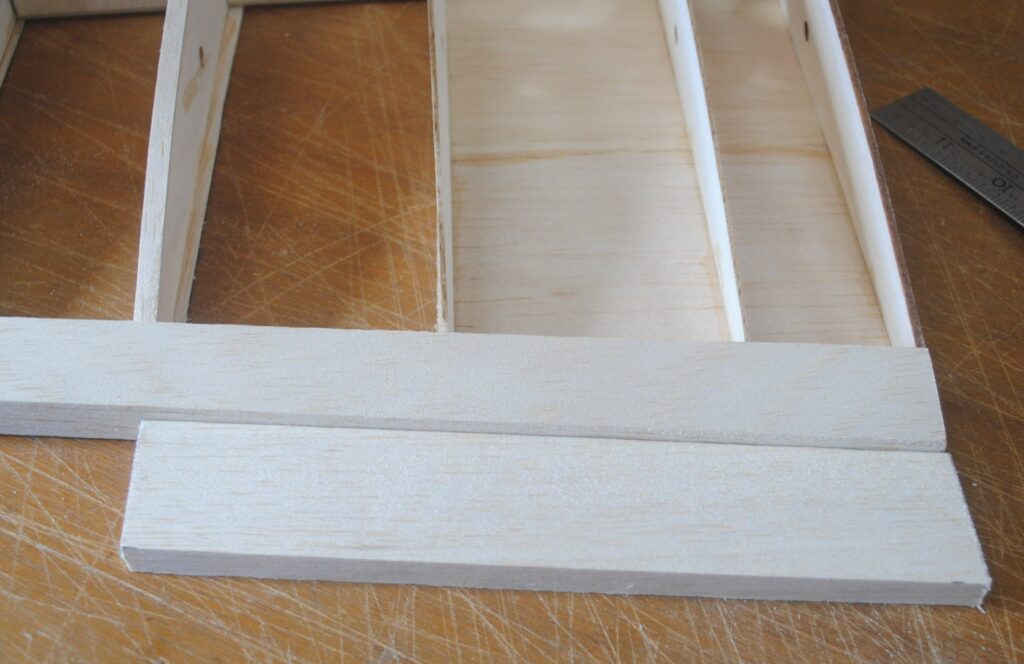 Cut a strip of 1/16″ balsa 1 3/16″ wide (one and three sixteenths) and add it to the top of the aileron. This sheet should be glued to the front of the trailing edge stick and the top of the ribs.
