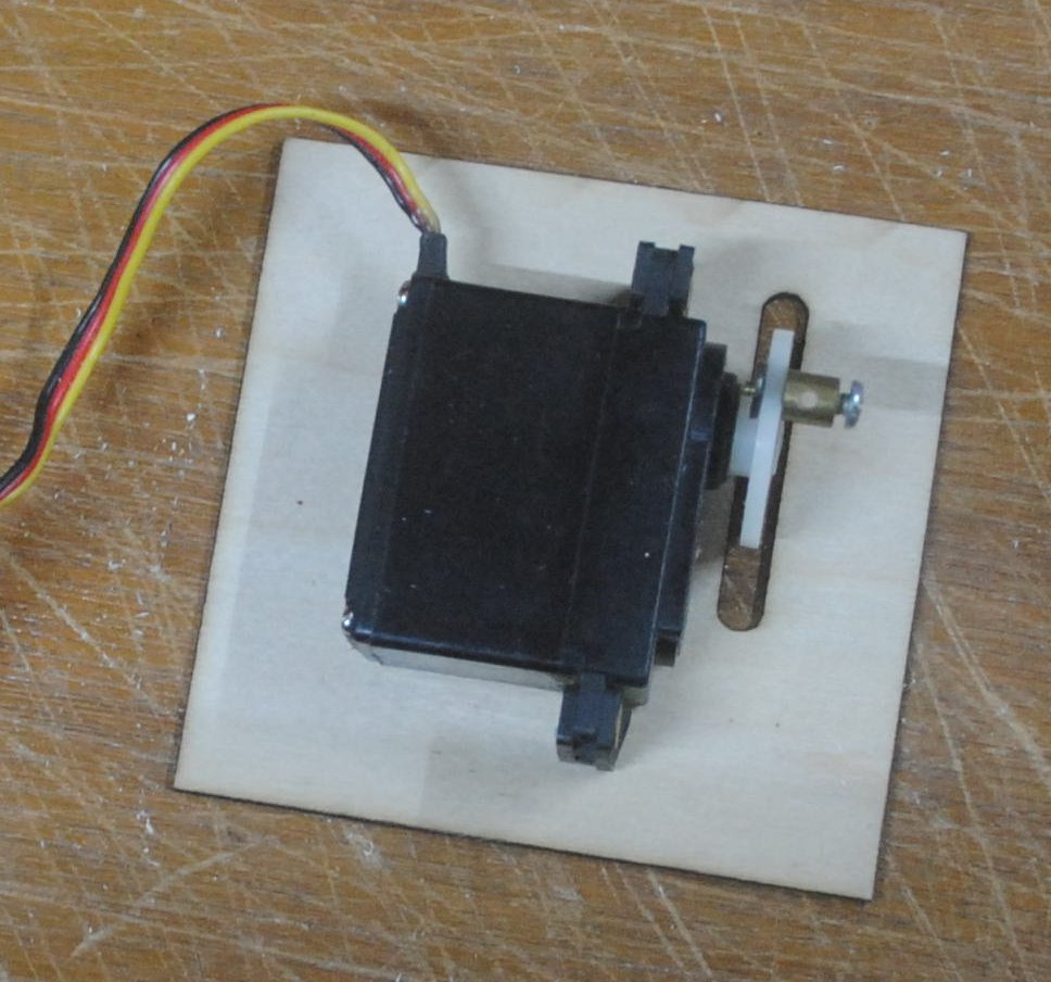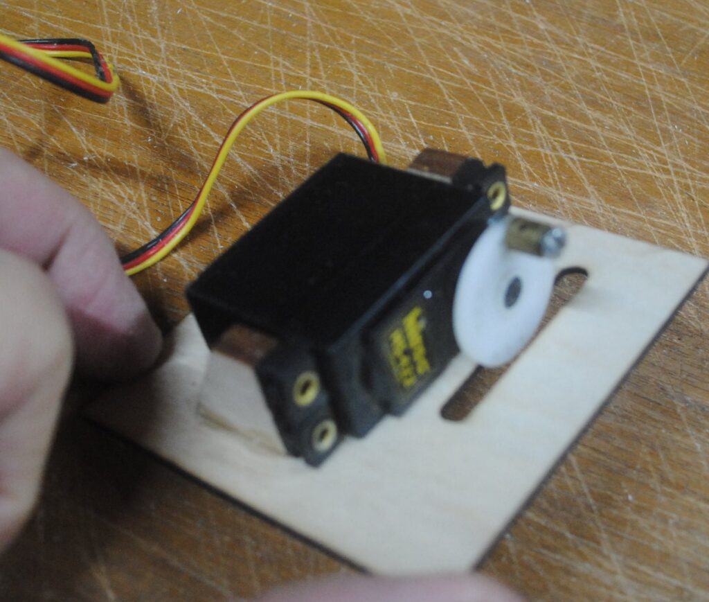 Starting with the first method, the first thing to do is glue the screw blocks to the back of the servo plate. Find the spot where the servo goes, with the output arm centered over the slot. Obviously your servo will have an arm, not a wheel, but my servo has a wheel because it’s convenient for lining up the servo.