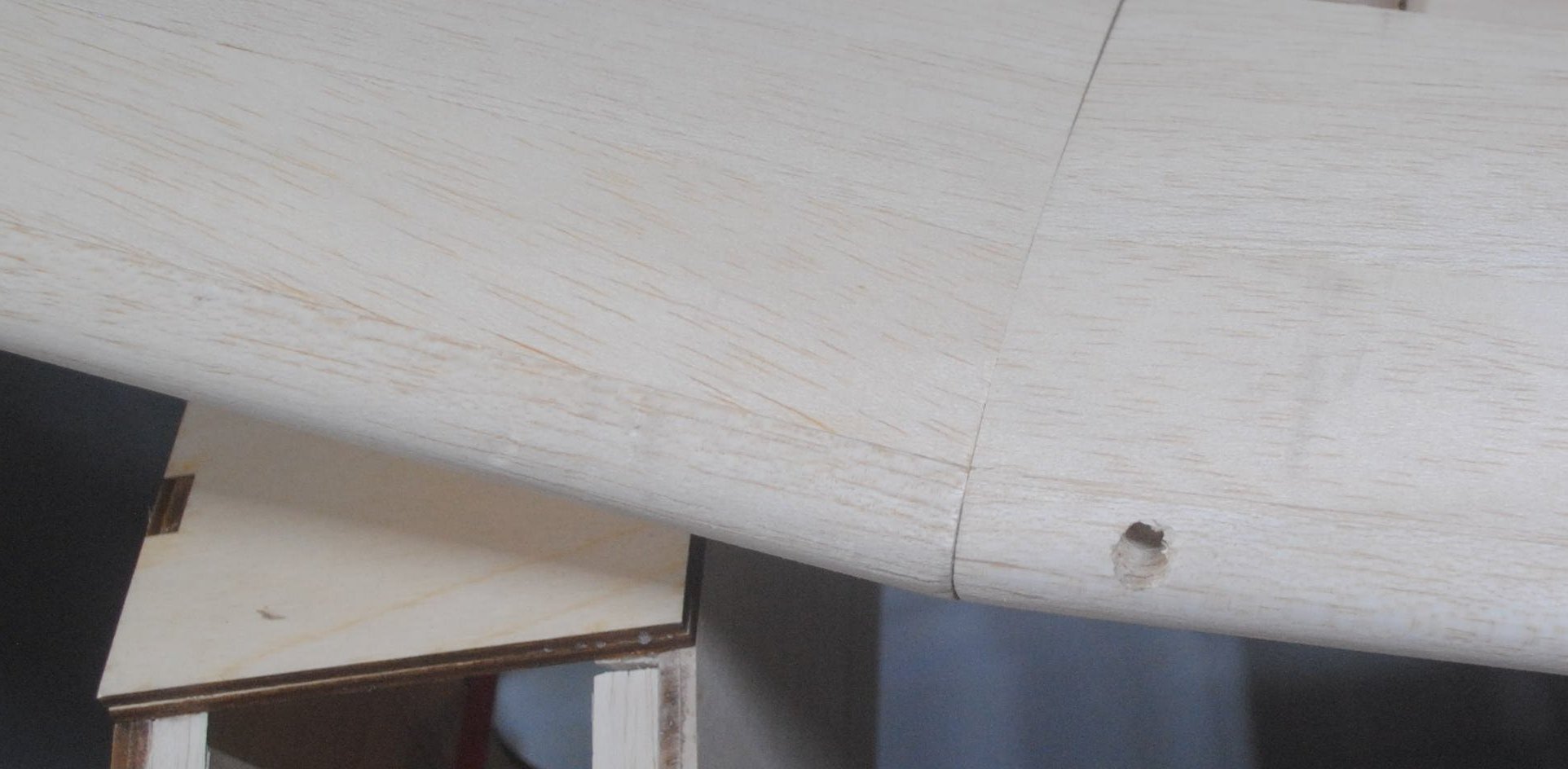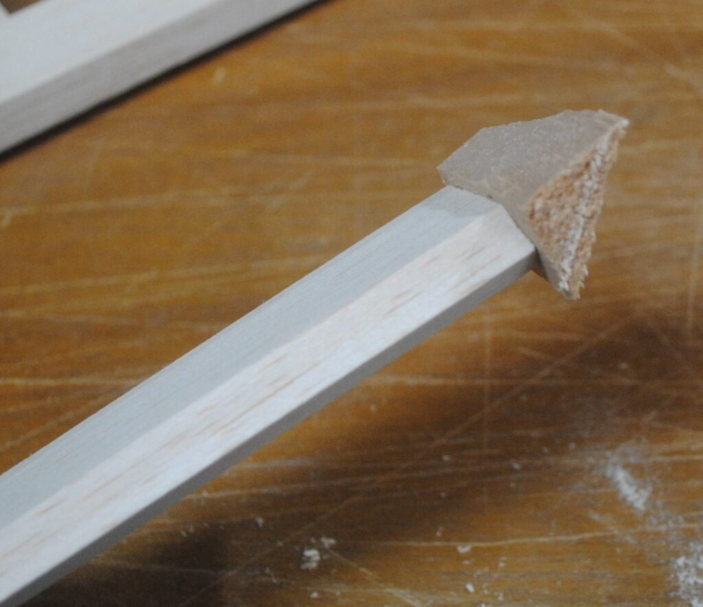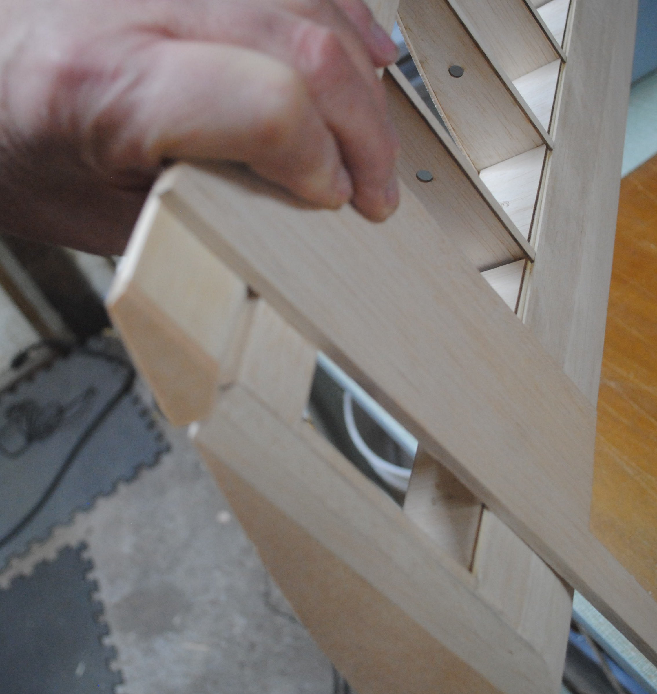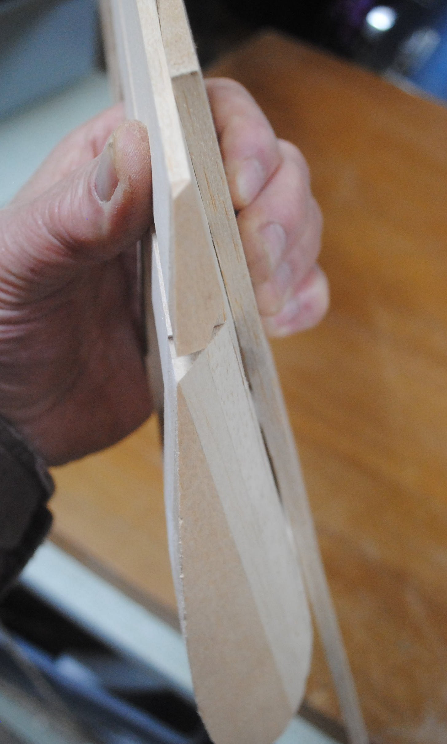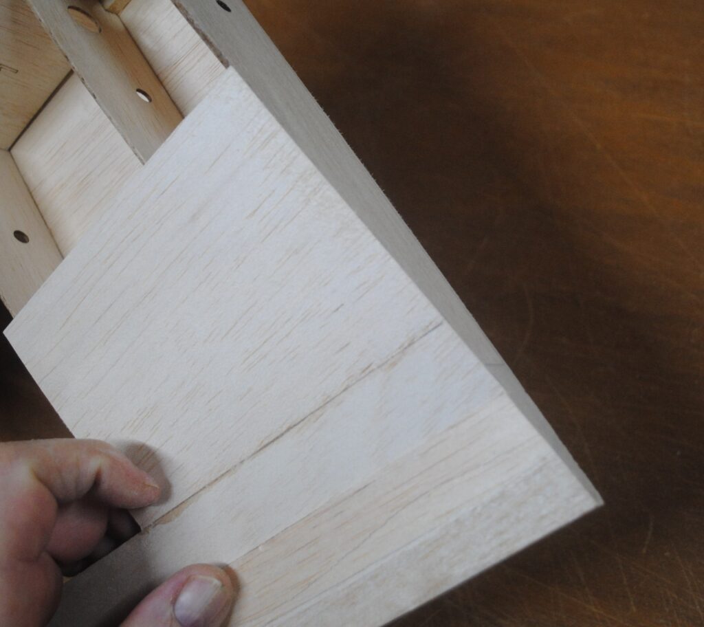 The block’s finished dimensions are 9/16″ tall in front and 3/16″ tall at the trailing edge. Sand the ends flush and carve the piece down to rough dimensions, then attach it to the wing.