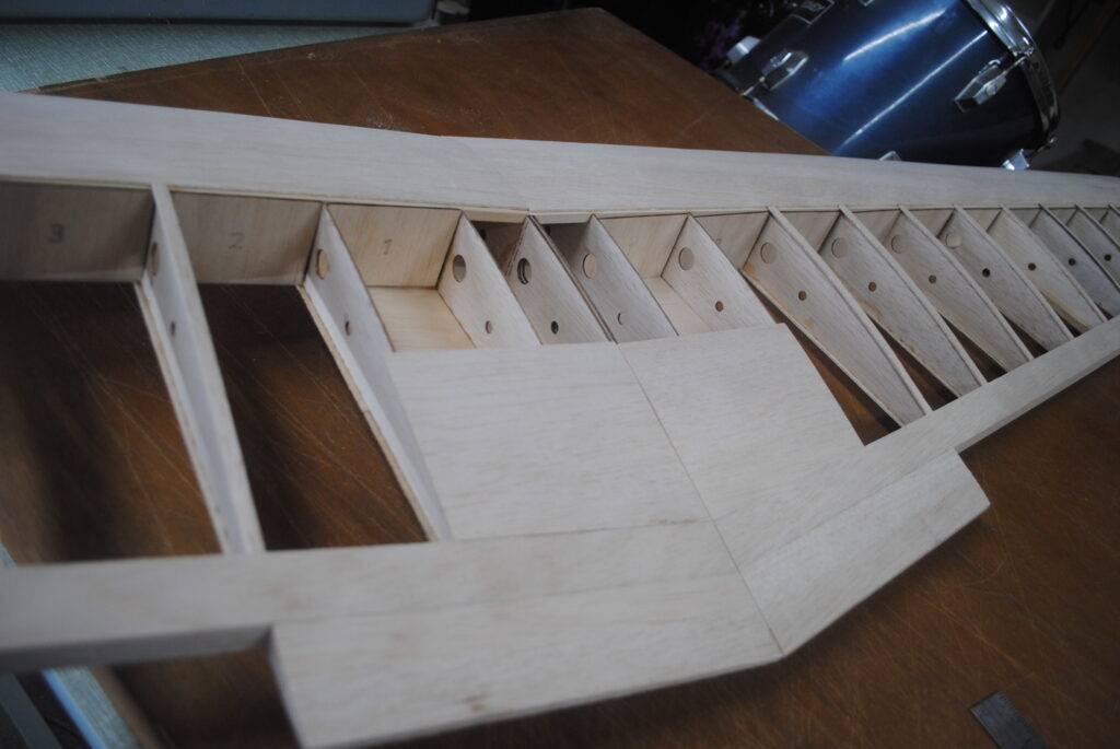 The wing center section has trailing edge blocks that are made in two layers. The first layer is 3/8 x 1 ½. It should extend to rib #4, or somewhere in that neighborhood. The exact length isn’t critical so don’t sweat it.