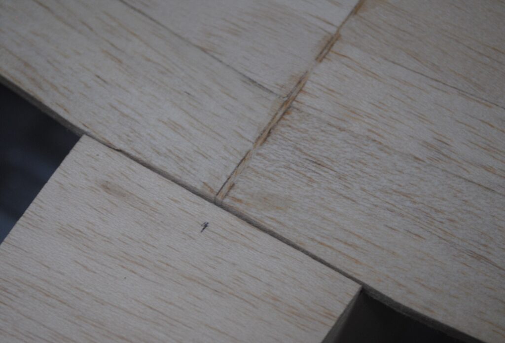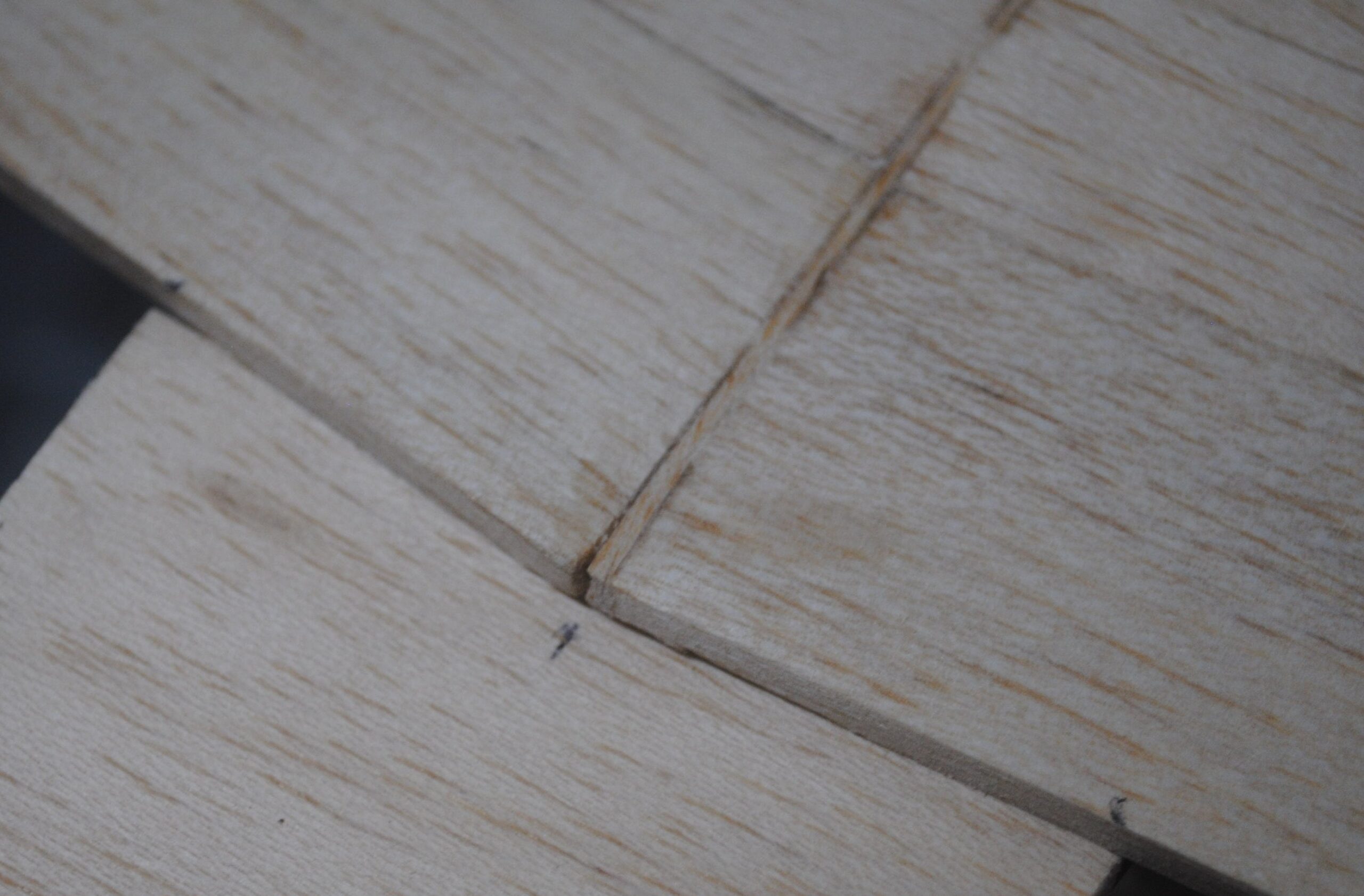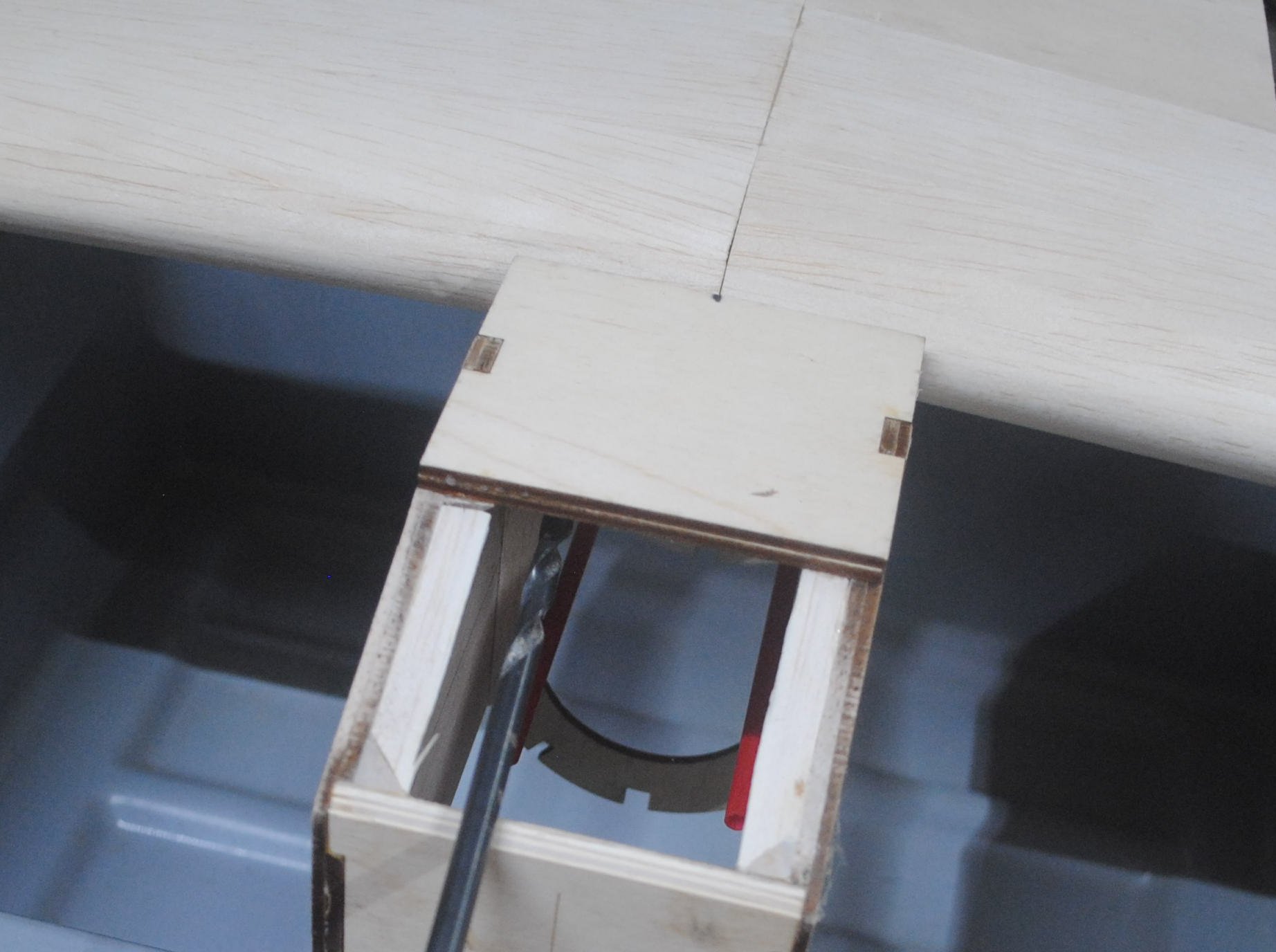 Check the fit to make sure the two wing panels come together properly with the correct dihedral angle, which is 4″ at the tip rib with the other panel flat on the table. If you accidentally sand the root crooked or curved, you can stick a piece of sheet balsa to it and sand it down again. A long sanding block will help your accuracy.