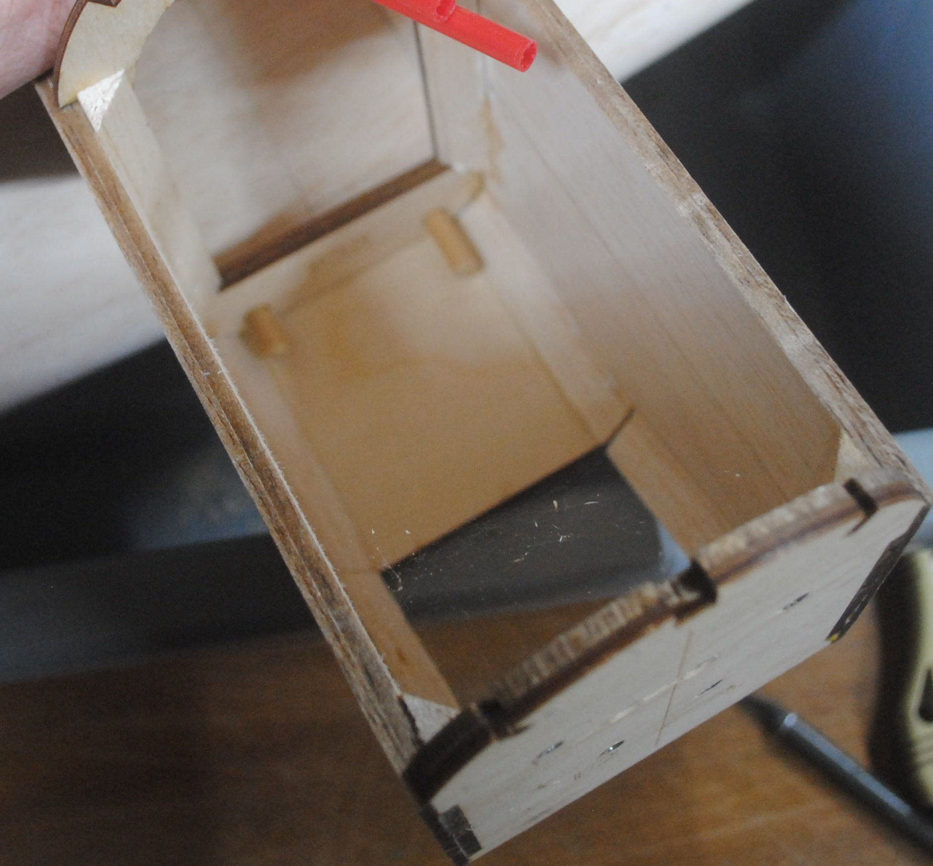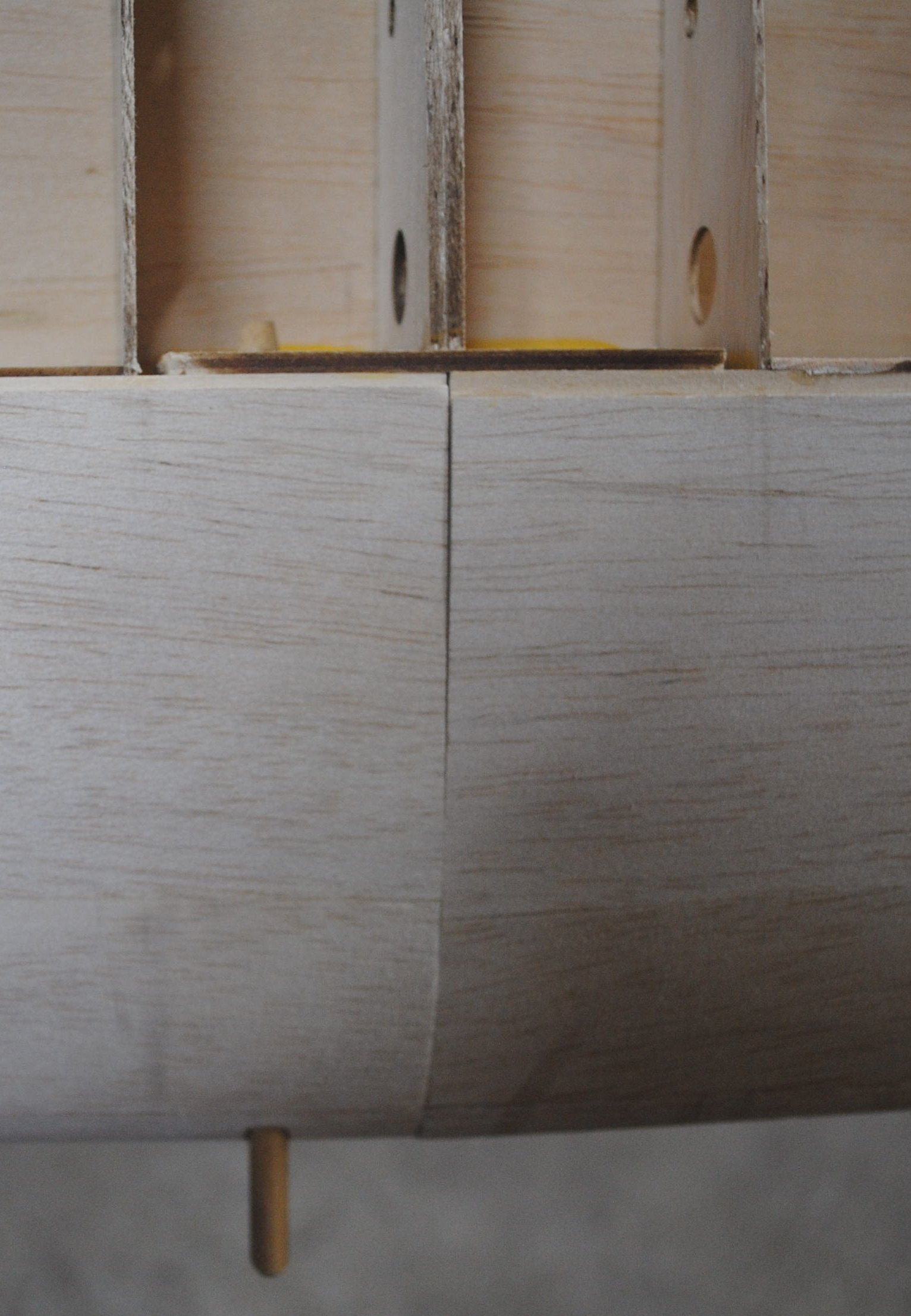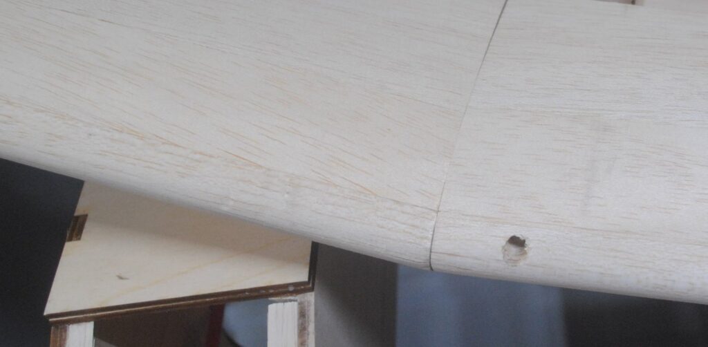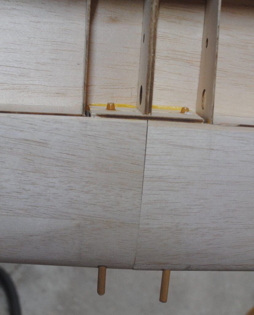 Put the wing back in place in the fuselage, with the dowel through the hole in F3. Drill the second hole and repeat the process with the second dowel. (Do not be tempted to drill both holes at once. If you do, the holes will not line up correctly.)