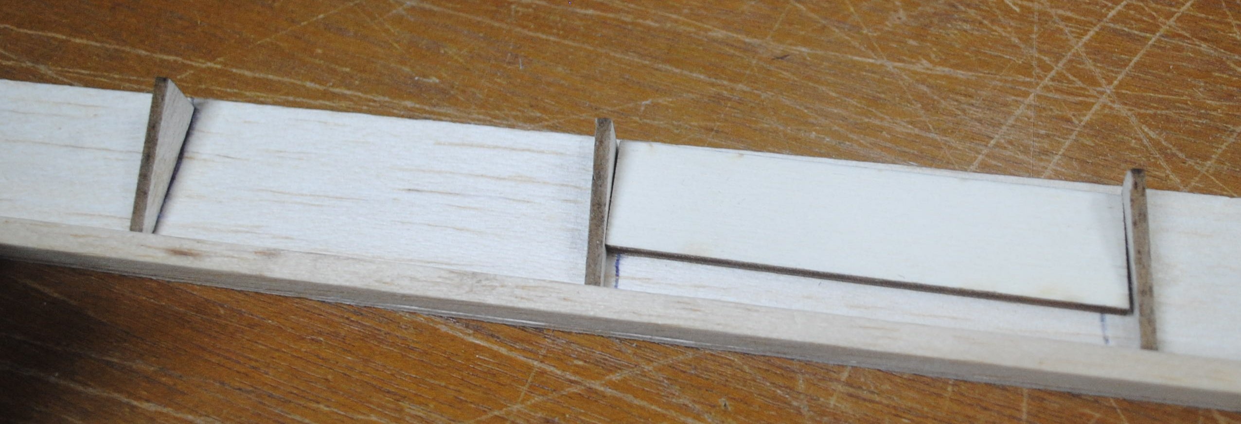 Attach 1/4 x 1/4 balsa sticks to the ribs on either side of the servo bay. The sticks should be on the outside of the servo bay. Also place a balsa stick at the rear of the servo compartment between the two ribs. Place it so the aft edge of the servo plate will land halfway across the stick.
