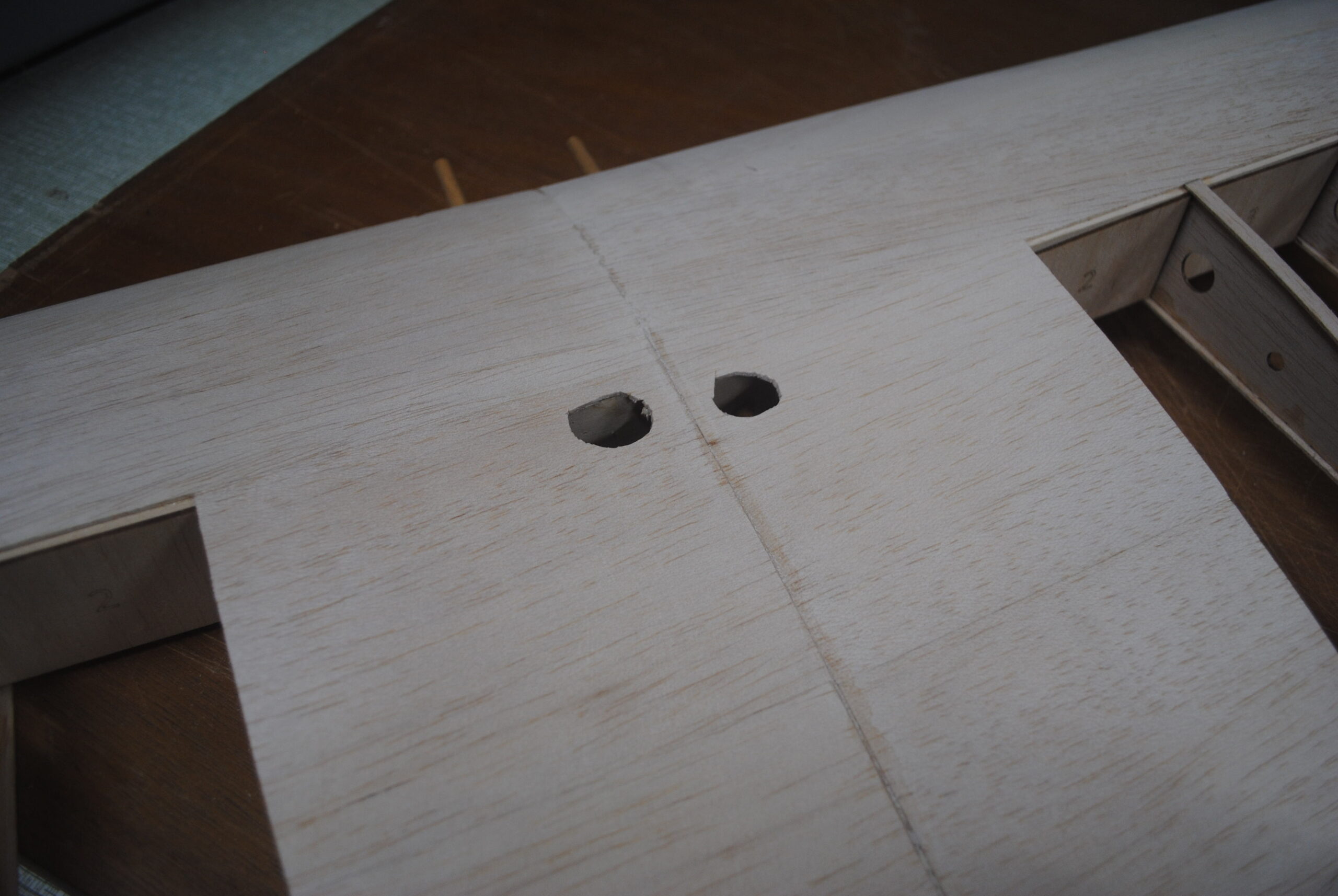 Attach the last of the top sheeting at the wing center section. Cut holes for servo wire access.