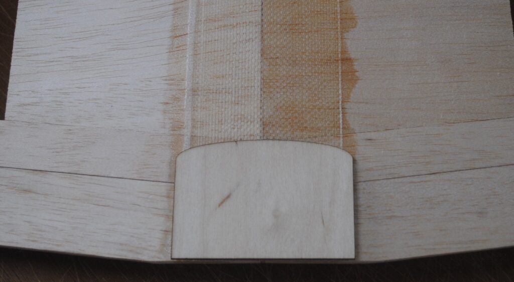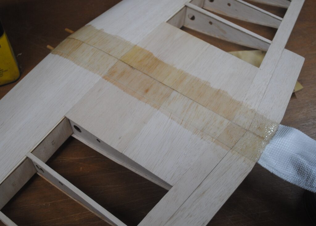 Use resin to attach glass cloth to the center section. The glass cloth supplied in the kit is a bit on the stiff side and has trouble going around corners, so I like to put it on one side first, trim it at the edge, then do the other side the next day.