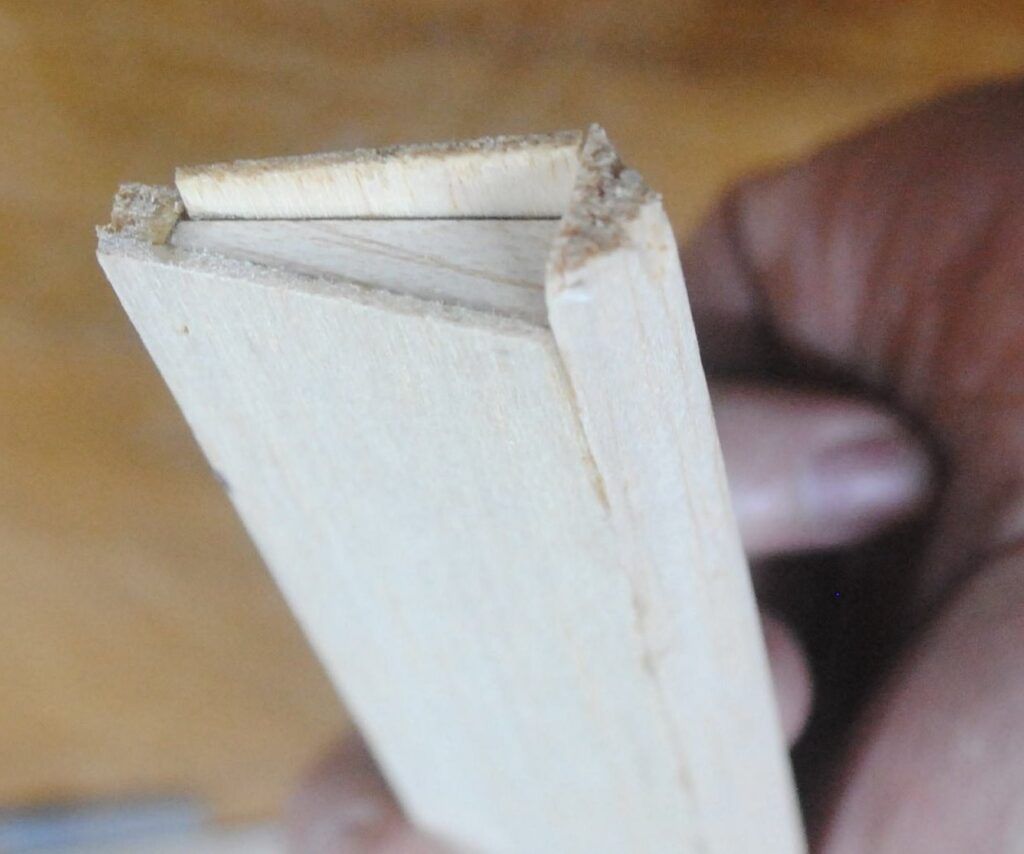 While the aileron is flat, glue a piece of 3/8″ balsa triangle to the aileron with the right angle corner facing forward.