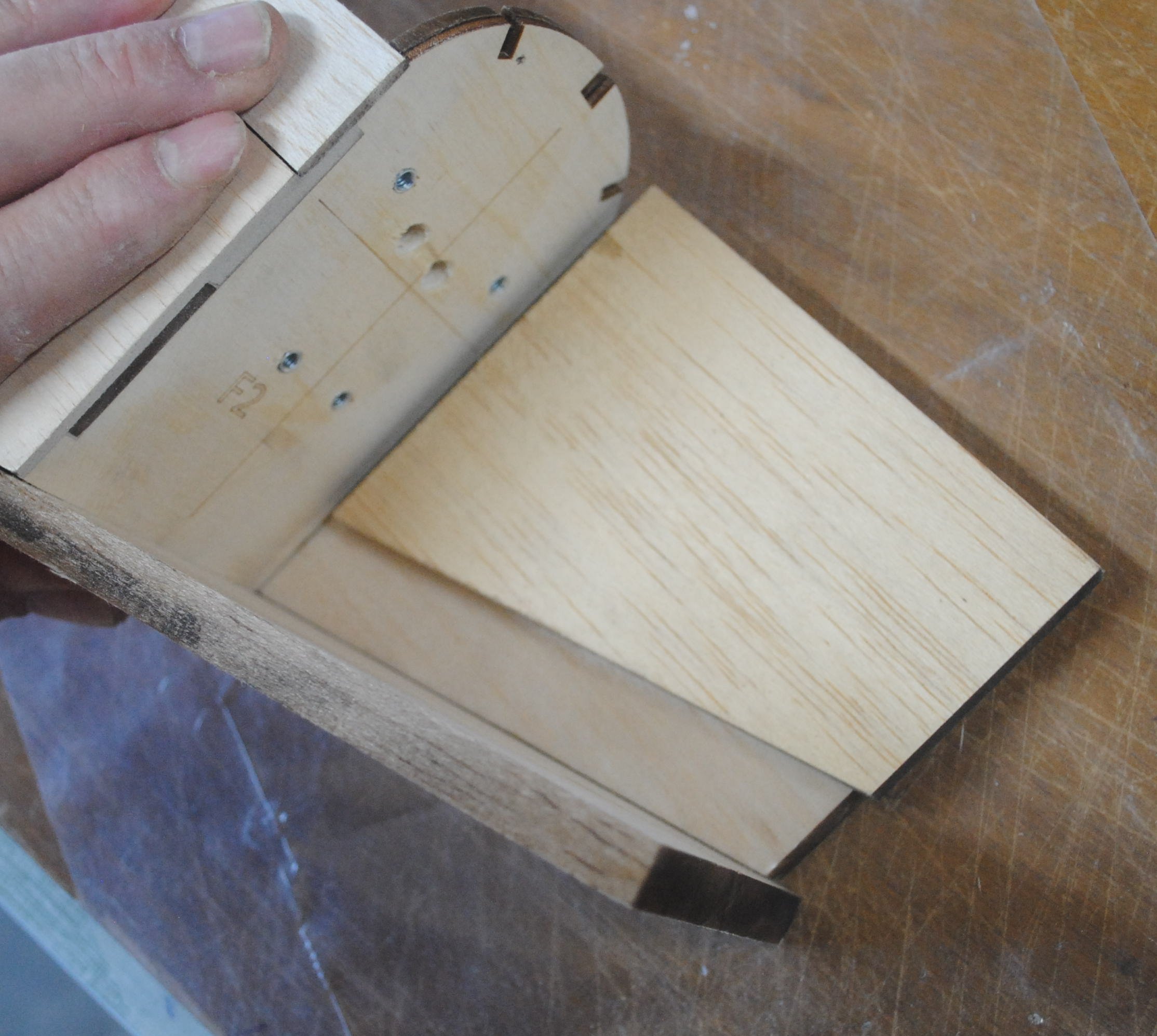 The next thing you’ll want to do is decide what kind of engine cowling you want. You could cut the bottom plank in half so it doesn’t extend ahead of the firewall, and install just the cowl cheeks. This is a classic look for a toy airplane. Or you could leave the bottom intact so it extends all the way to the front of the cheeks for a simple look. Another option would be to sand the rear edge of each cowl cheek to a slight angle and install them slanted, so the engine bay narrows at the front. Or you could trim the bottom flush with the firewall, mount your engine upside down and add a thick plank to the top. You can attach the supplied ring and taper the entire cowl to the ring. Or you could leave the cowl off entirely, as I did with prototype #1.