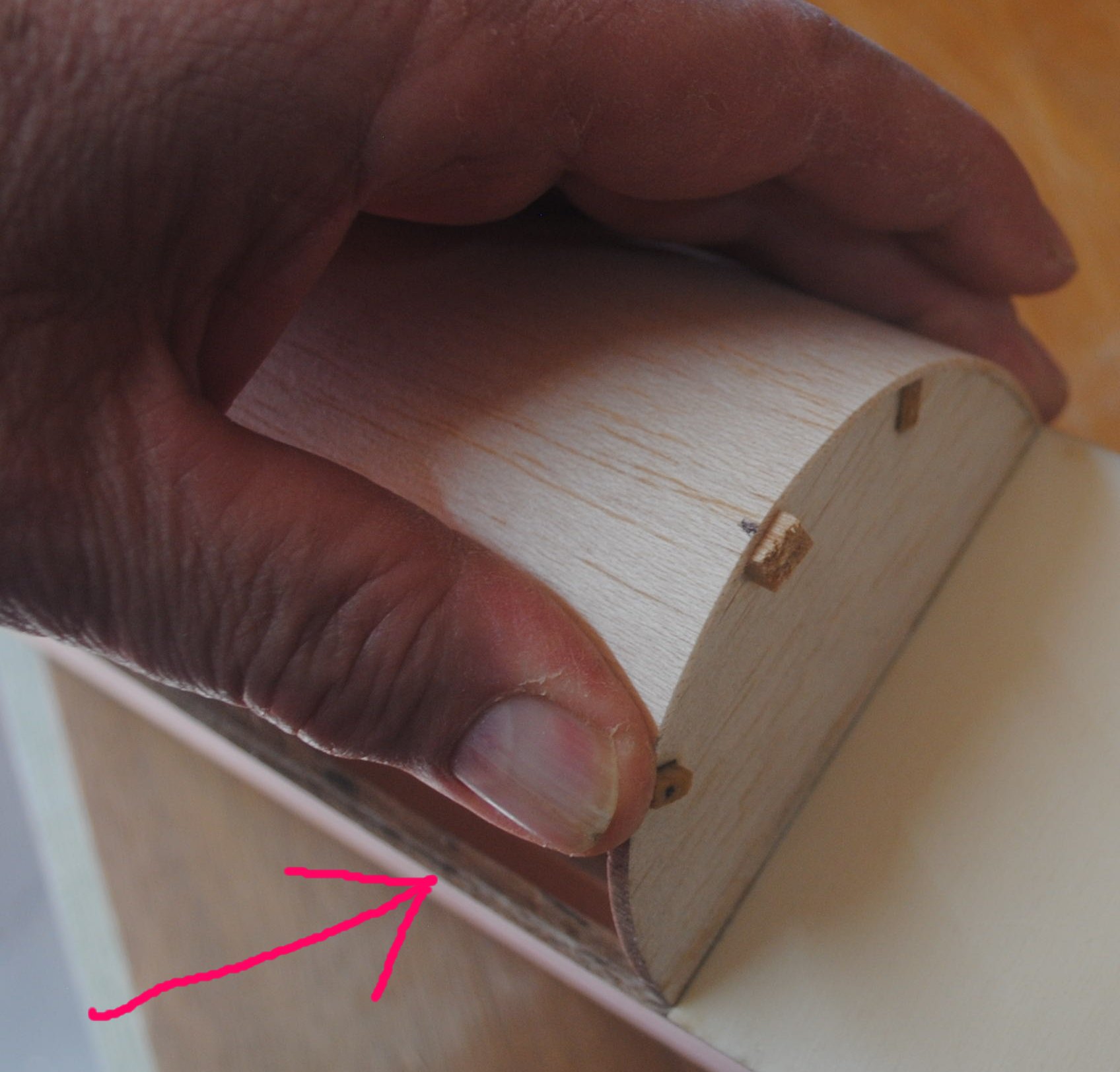 Place a piece of 1/16 x 3 x 16 balsa on top of the fuselage side just in front of the cockpit floor, and roll it around the curve. Mark it with a pen at the middle of the balsa stick at the top of F5. Make one for each side. Note that the following photo shows the first half being held in place and marked. The arrow indicates that there is no balsa attached to the other side.