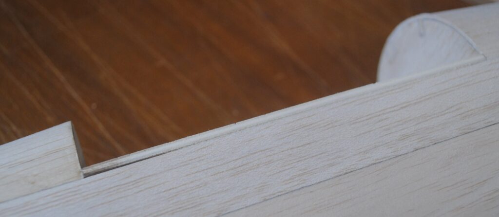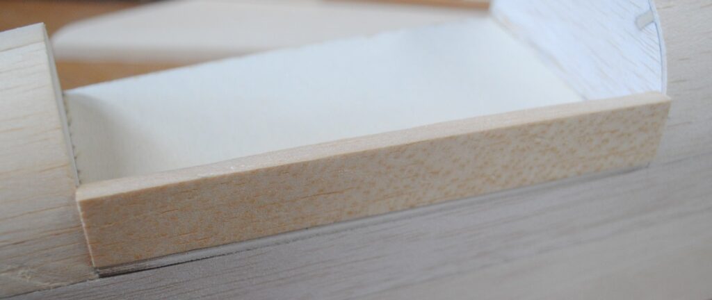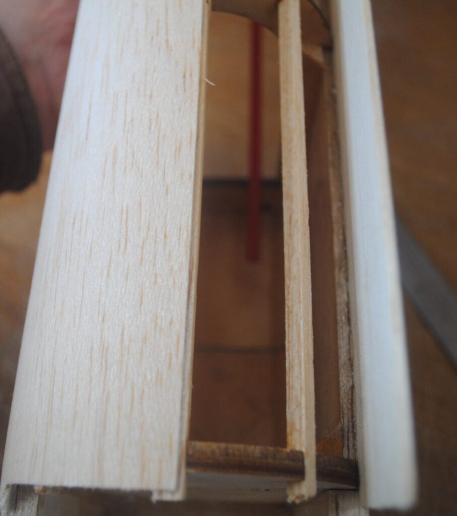 The cockpit sides are made from 1/4″ x 3/4″ balsa sticks about 6 inches long. Cut the stick to fit between the head rest and the instrument panel.