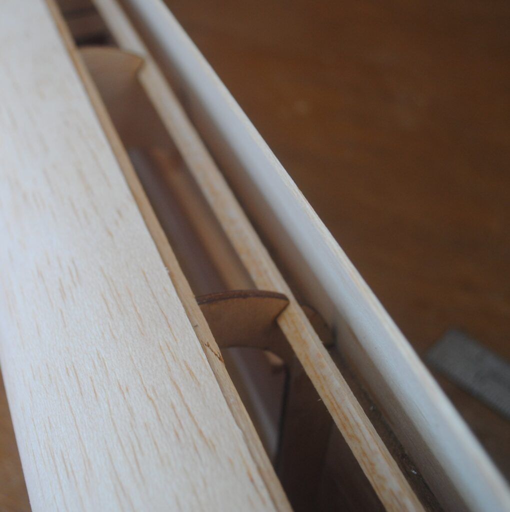 You can see that I glued them with CA and spritzed a tiny bit of accelerator from the outside to make the joint secure. I don’t want it coming undone while I’m curling it around the bulkheads.
