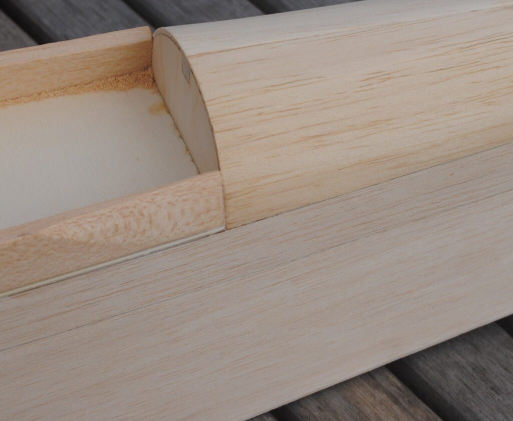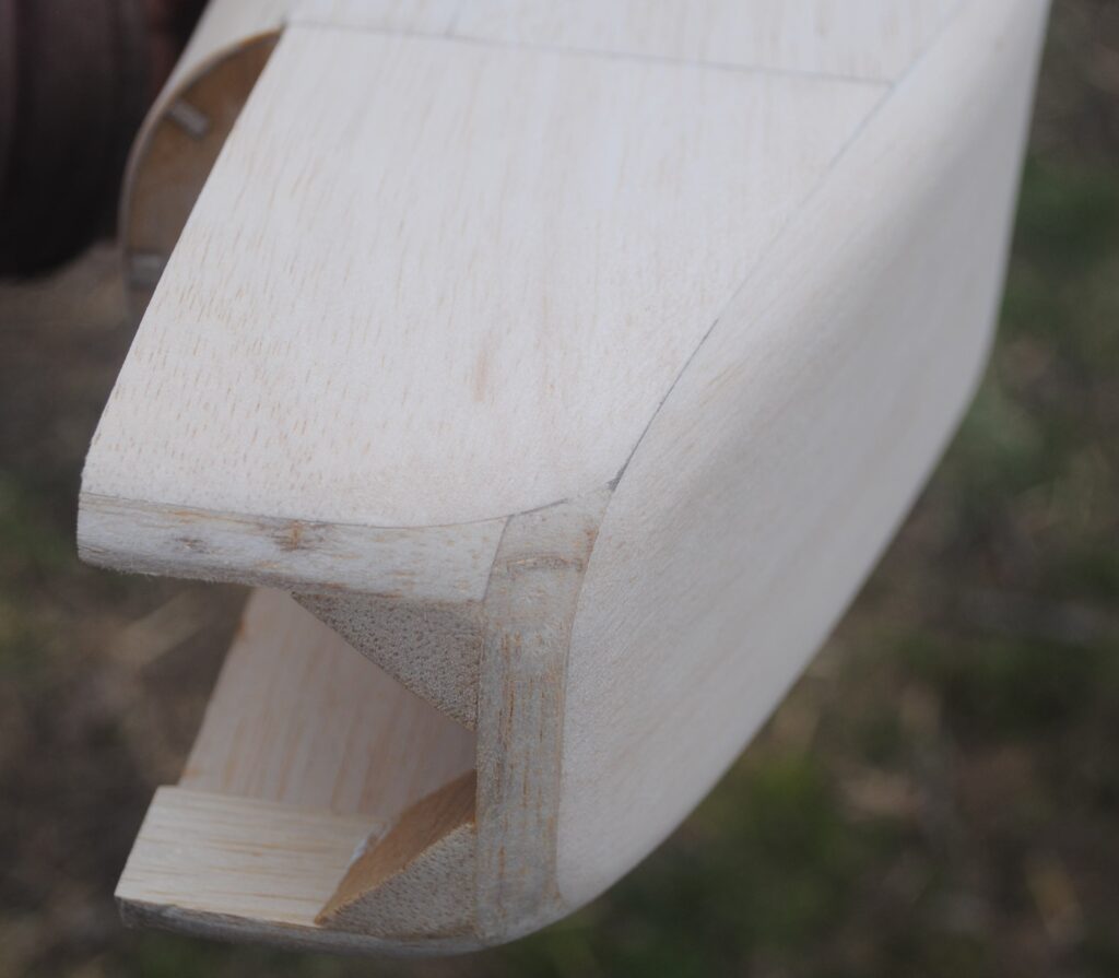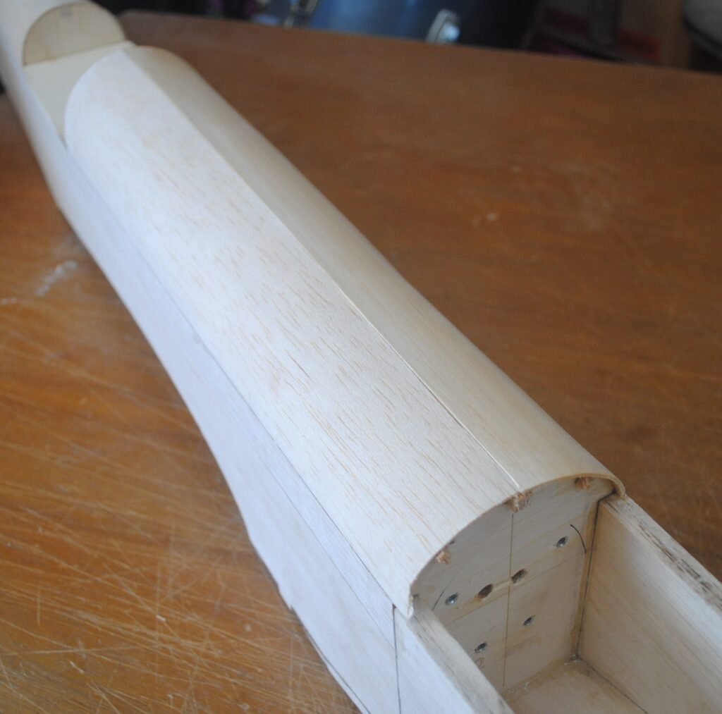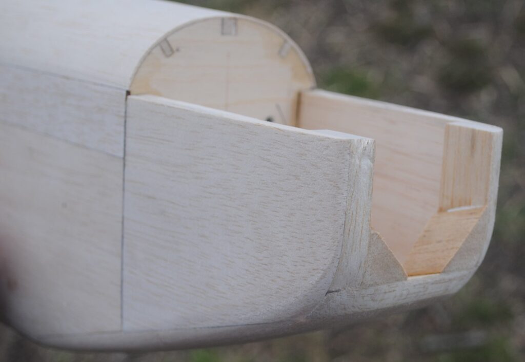 Now the fuselage is pretty much done, and it just needs final sanding before covering. Start by sanding the cockpit side stick flush with the fuselage side.
