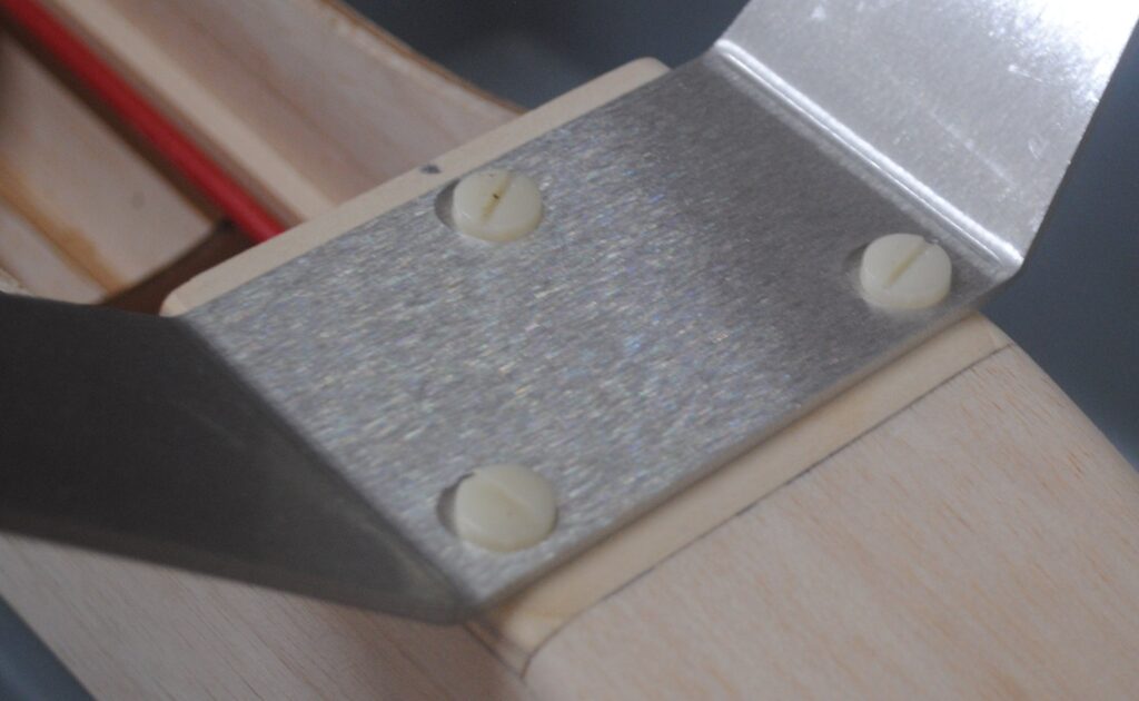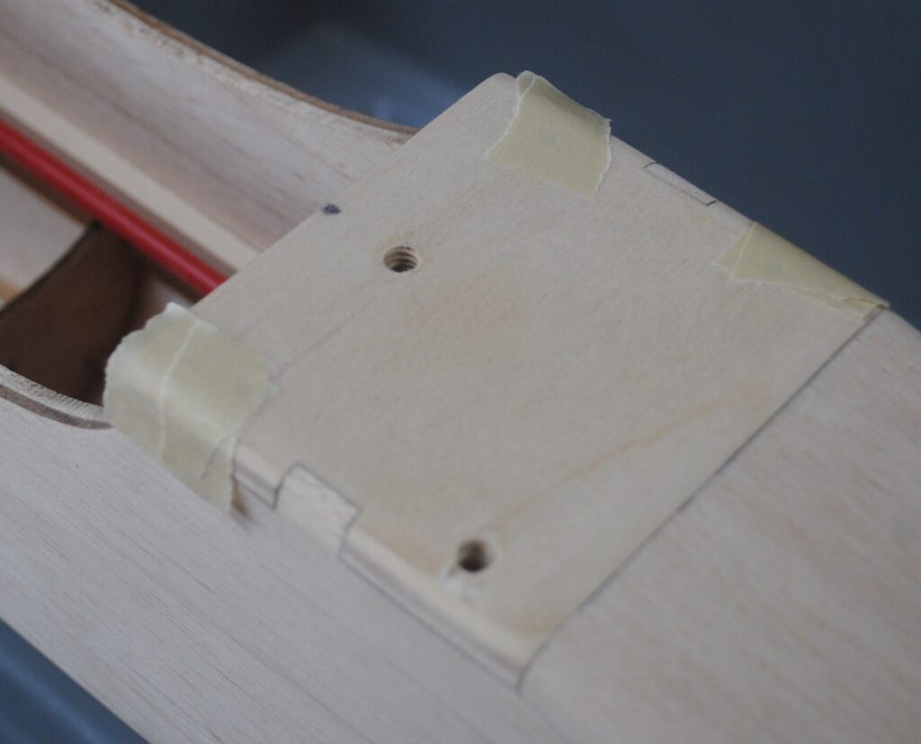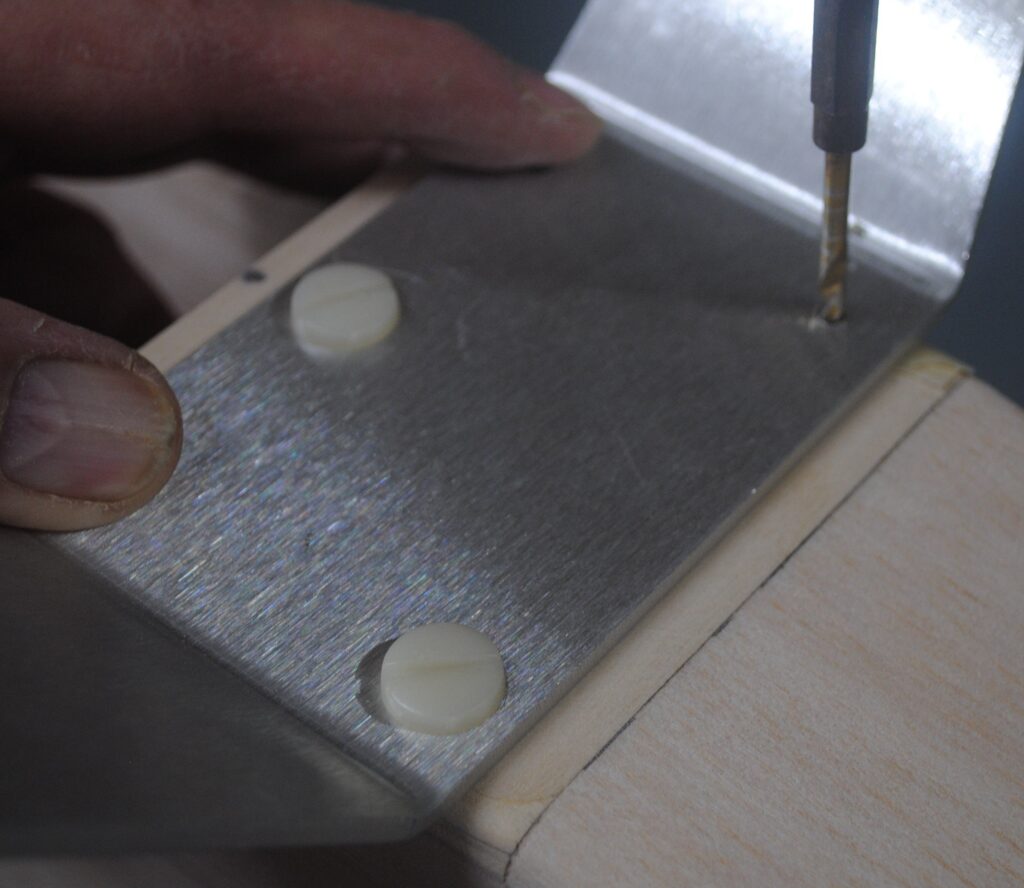 Attach the landing gear firmly with this screw. Drill through the second hole through the landing gear with a 1/8″ bit. Take off the landing gear, enlarge the second hole to 1/4″ in the landing gear and 3/16″ in the fuselage, harden the hole, tap to 1/4-20.