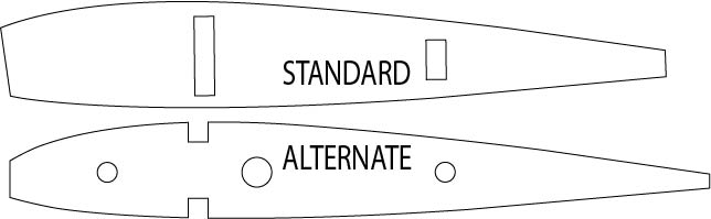 If you don’t feel like building the crazy Goldberg Falcon 40 wing, I also offer an alternate wing with a 3/8″ balsa leading edge, 1/4″ balsa trailing edge, and 1/4″ bass or spruce spars on top and bottom. The wing is to be built as a D Tube structure with 1/16″ balsa sheeting on top and bottom, 1/16″ shear webs, and cap strips. Here is a standard wing rib and an alternate rib for your reference. Overall outside dimensions of the wing are the same either way.