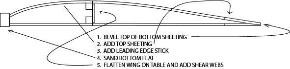 • Leading edge is 3/8″ thick.  Wing spars are 3/16″ square bass wood, plus shear webs.  Build the wing on the plan, but there’s no tapered trailing edge stock.  Use trailing edge sheeting about an inch to an inch and a half wide.  Leading edge sheeting extends from the spar to the leading edge.  Add cap strips in the middle.  Alternatively you can sheet the entire wing.  In any case, sheeting is 1/16″ balsa.  Here’s an illustration of the wing construction details.