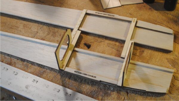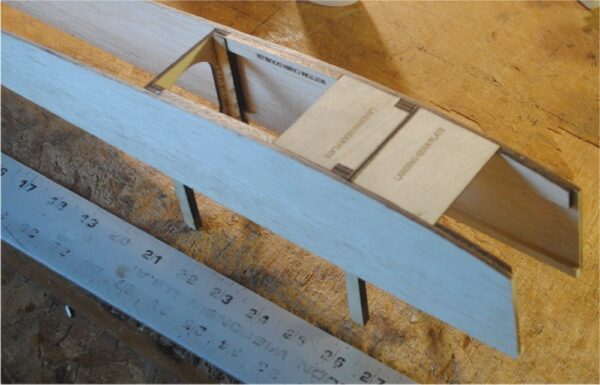 • Cabane struts and rails are 1/8″ plywood to be laminated to make 1/4″ plywood.  Rails are lengthened for more rubber band space.  Find where your wing goes in relation to the fuselage, and attach the rails so you get an equal length extending fore and aft beyond the wing.