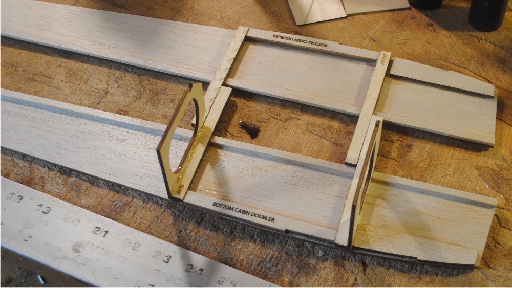 • Kit includes fuselage side doublers fore and aft of F2.  Doublers are notched for 1/16″ ply landing gear plates.  See photos below.  After these plates are in place, attach the outer 1/16″ ply floor.  This will create a solid foundation for your landing gear of choice.