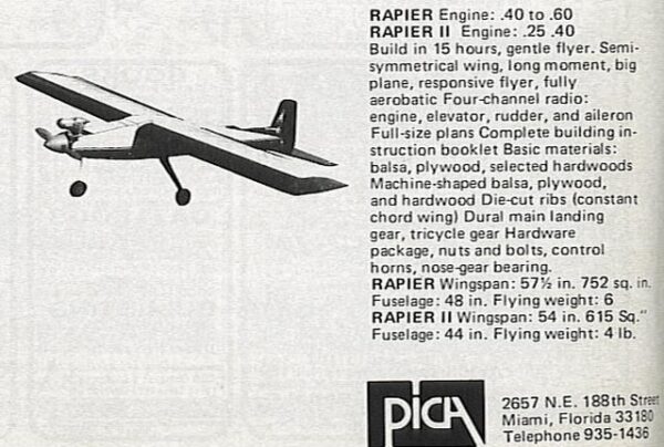 The Rapier is an Ugly Stik clone from Pica. The plan calls for a 40 size engine, but I’m sure a lot of guys would use a 60.