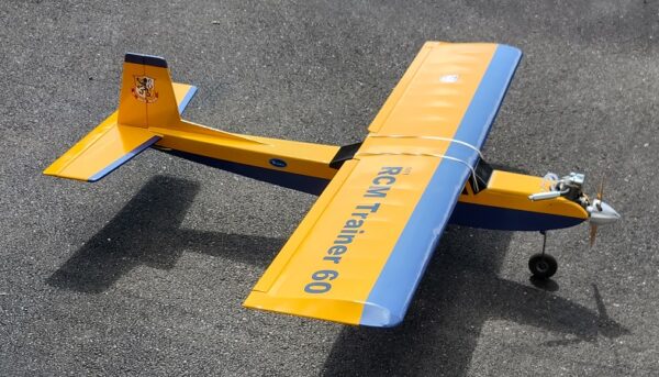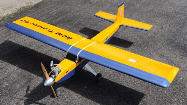 This is the RCM Advanced Trainer, also known as the RCM Trainer or the RCM Trainer 60, designed by Joe Bridi and included in the RCM Flight Training Course in the early 1970s. Wingspan is 58.5 inches. It has a thick symmetrical airfoil and is essentially a high wing Kaos with a constant chord wing.