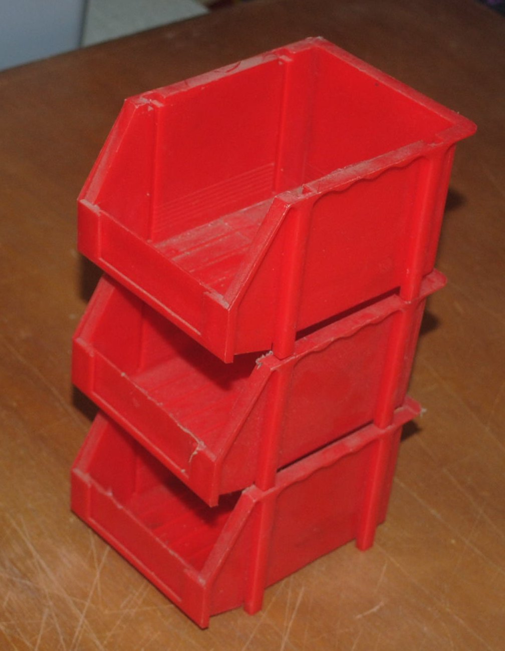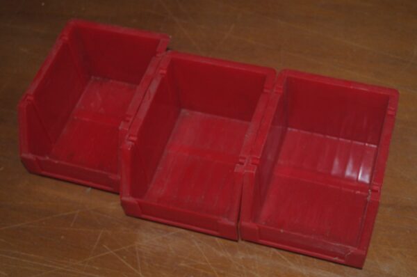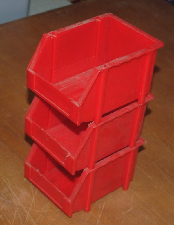 Three stackable bins for your workbench. Each bin is 3″ tall, 4″ wide, 5″ long. All three for one price.